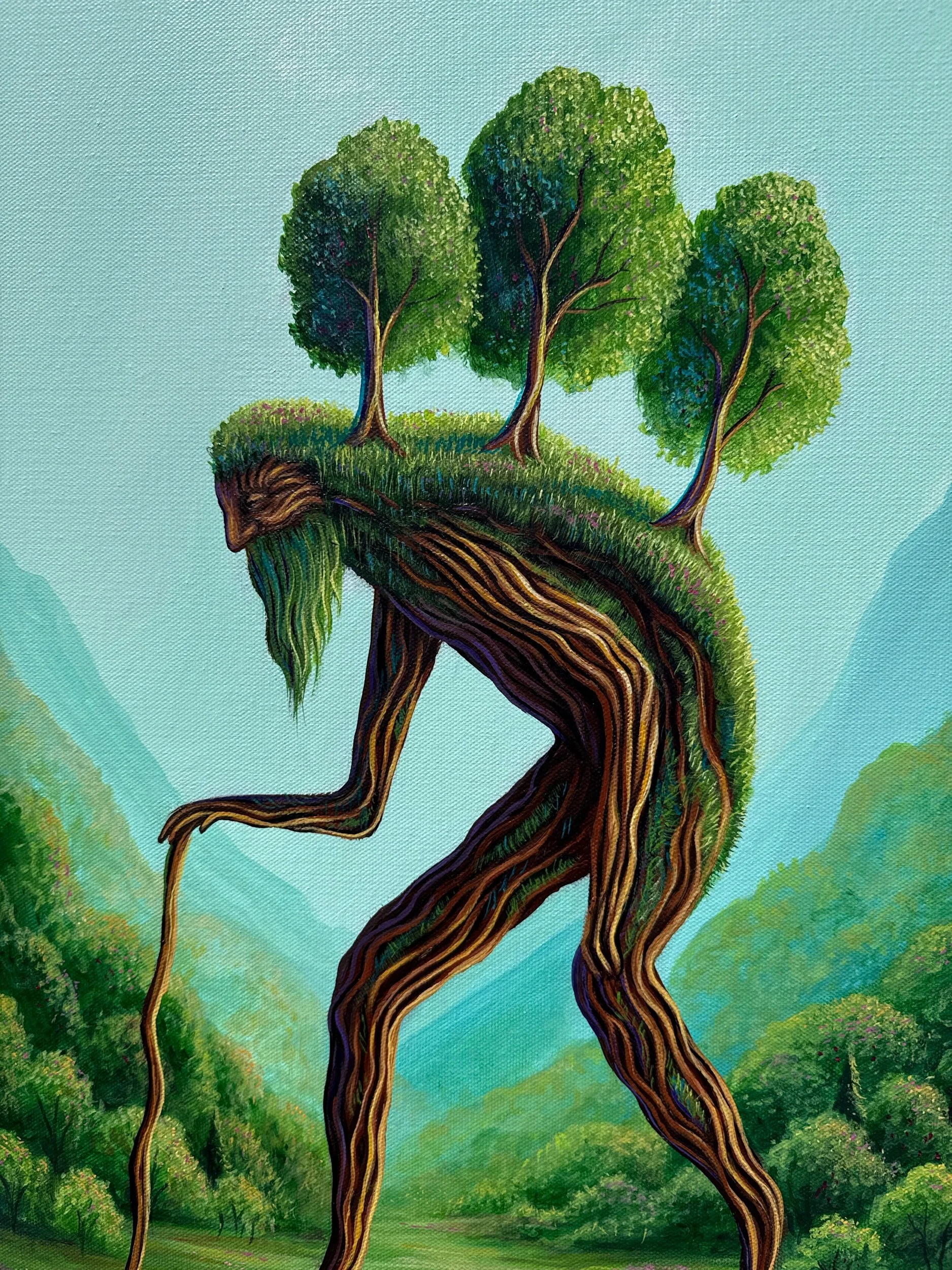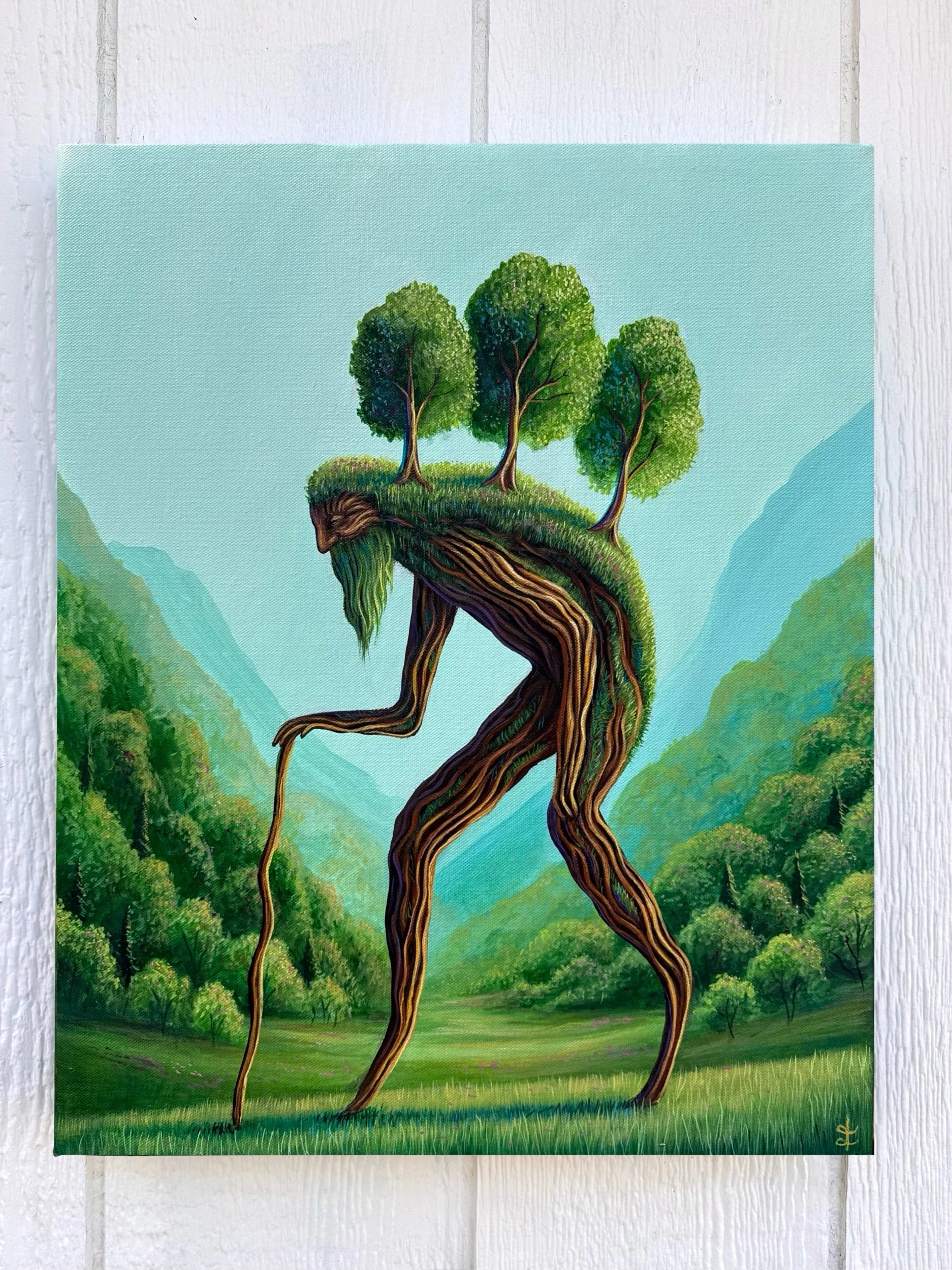 A Return to Nature, by Lindsay Liboiron is a whimsical painting of an old tree who carries the forest. Painted in acrylic on a 20 × 16 inch gallery wrapped canvas, 1.5 inch depth.