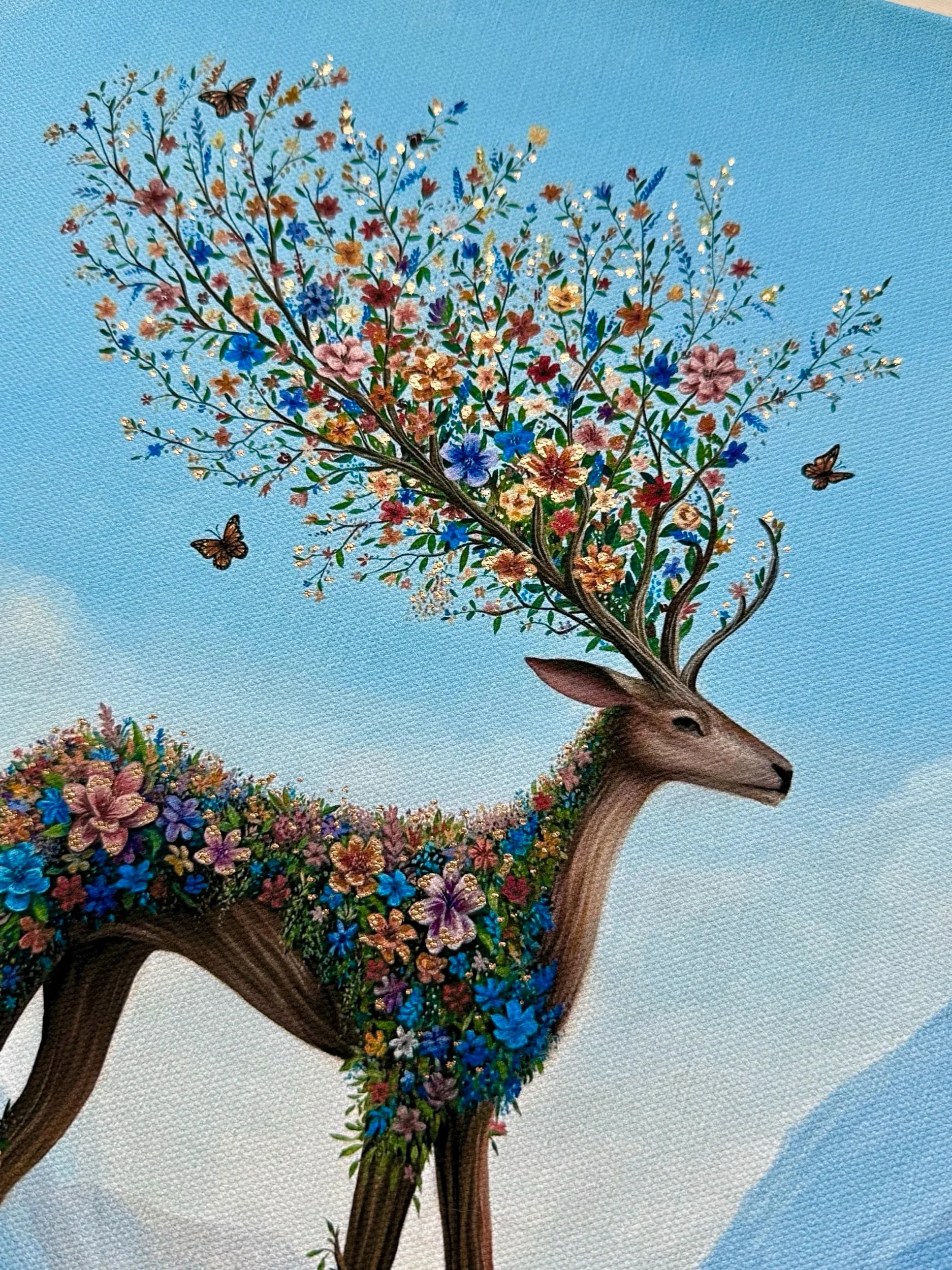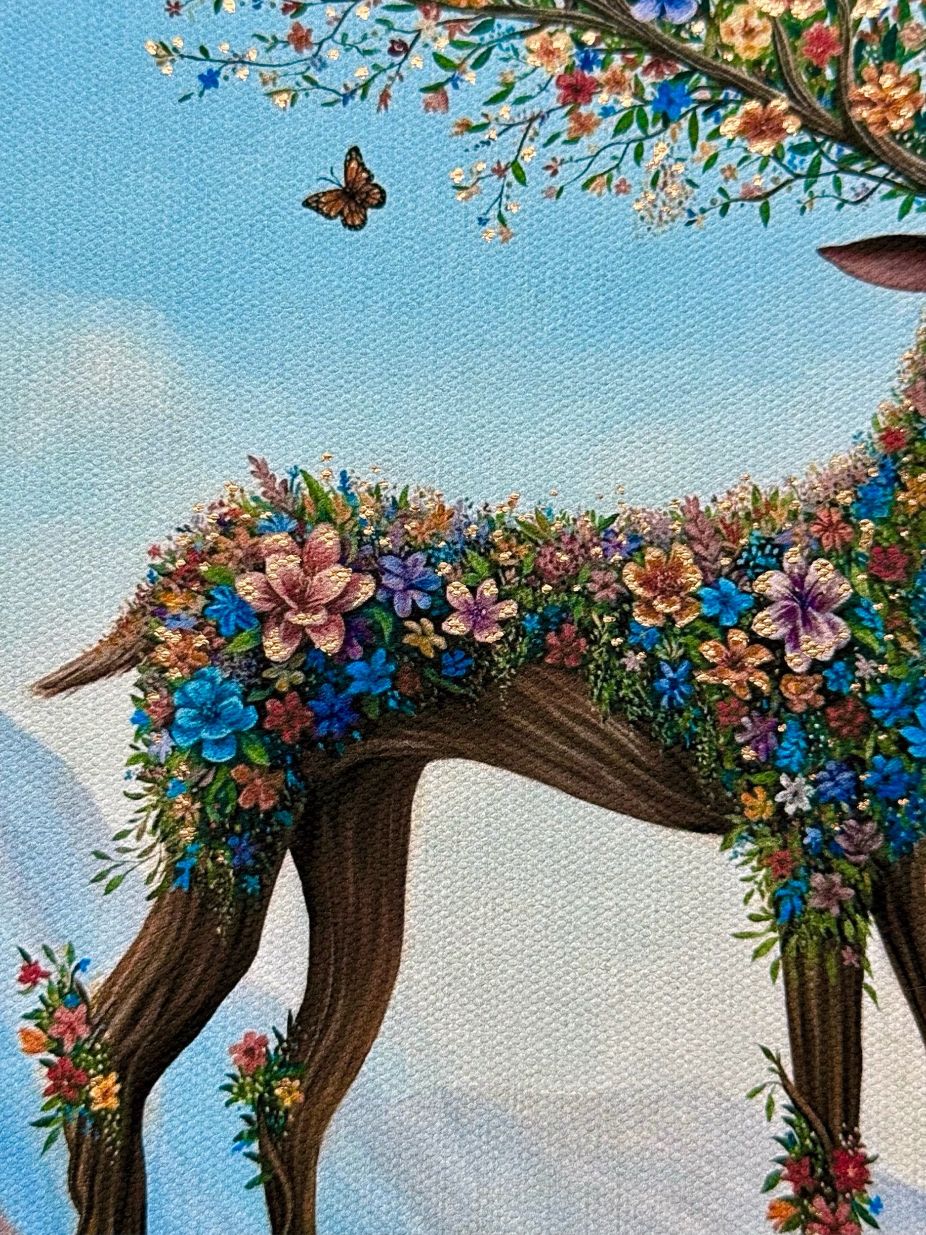 Antlers in Bloom is a 16 × 12 inch canvas print, hand-embellished with gold details. Capturing the vibrant colours and details of the original painting. This canvas print is gallery wrapped by the artist around a 1.5 inch wood frame.