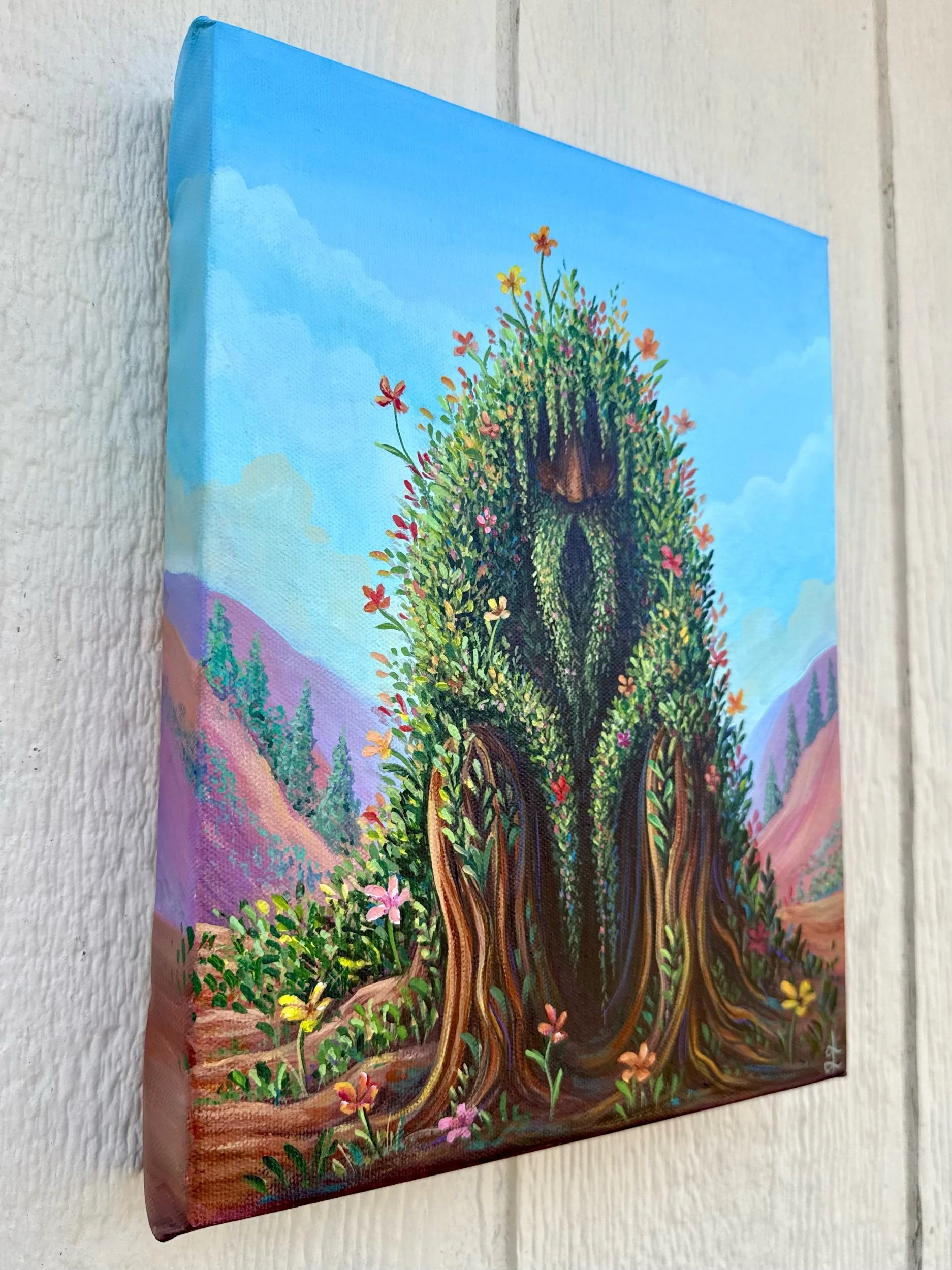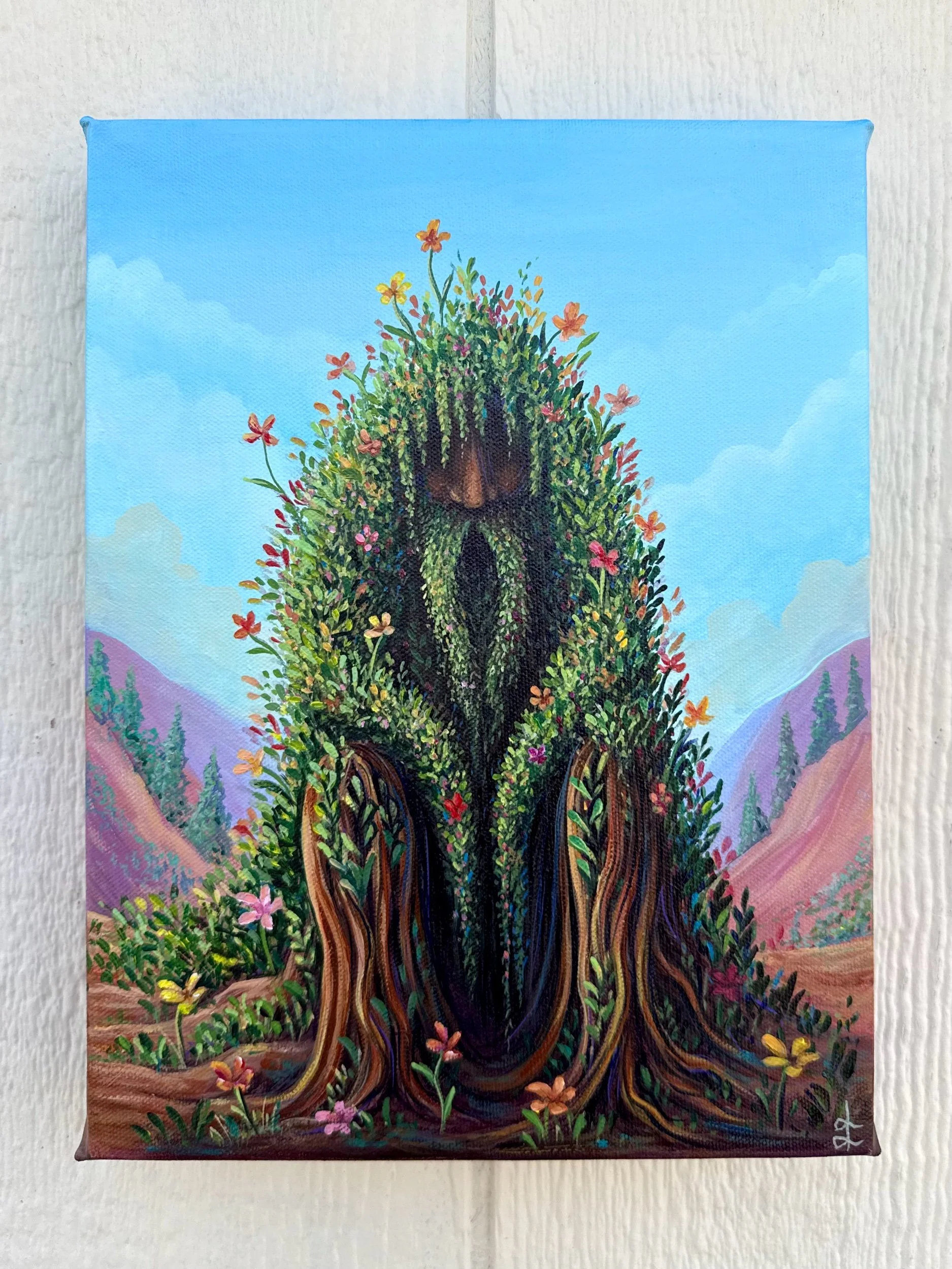Becoming the Meadow, by Lindsay Liboiron is a whimsical painting featuring a creature covered in vines and flowers. Painted in acrylic on a 12 × 9 inch gallery wrapped canvas, 1.5 inch depth.