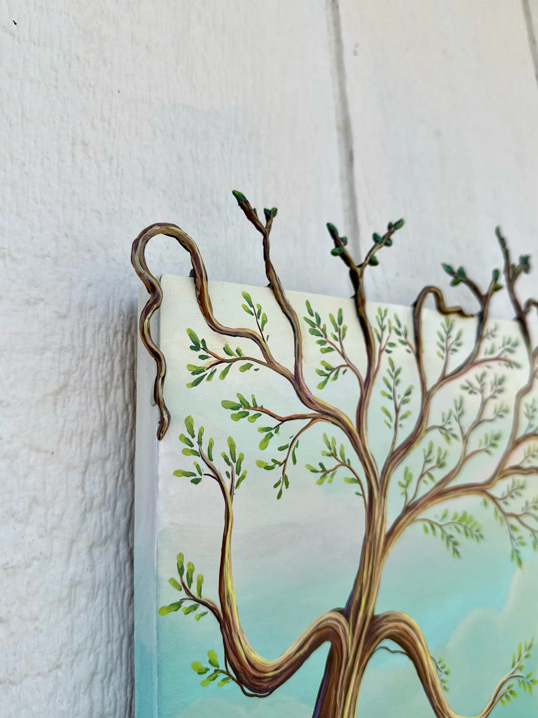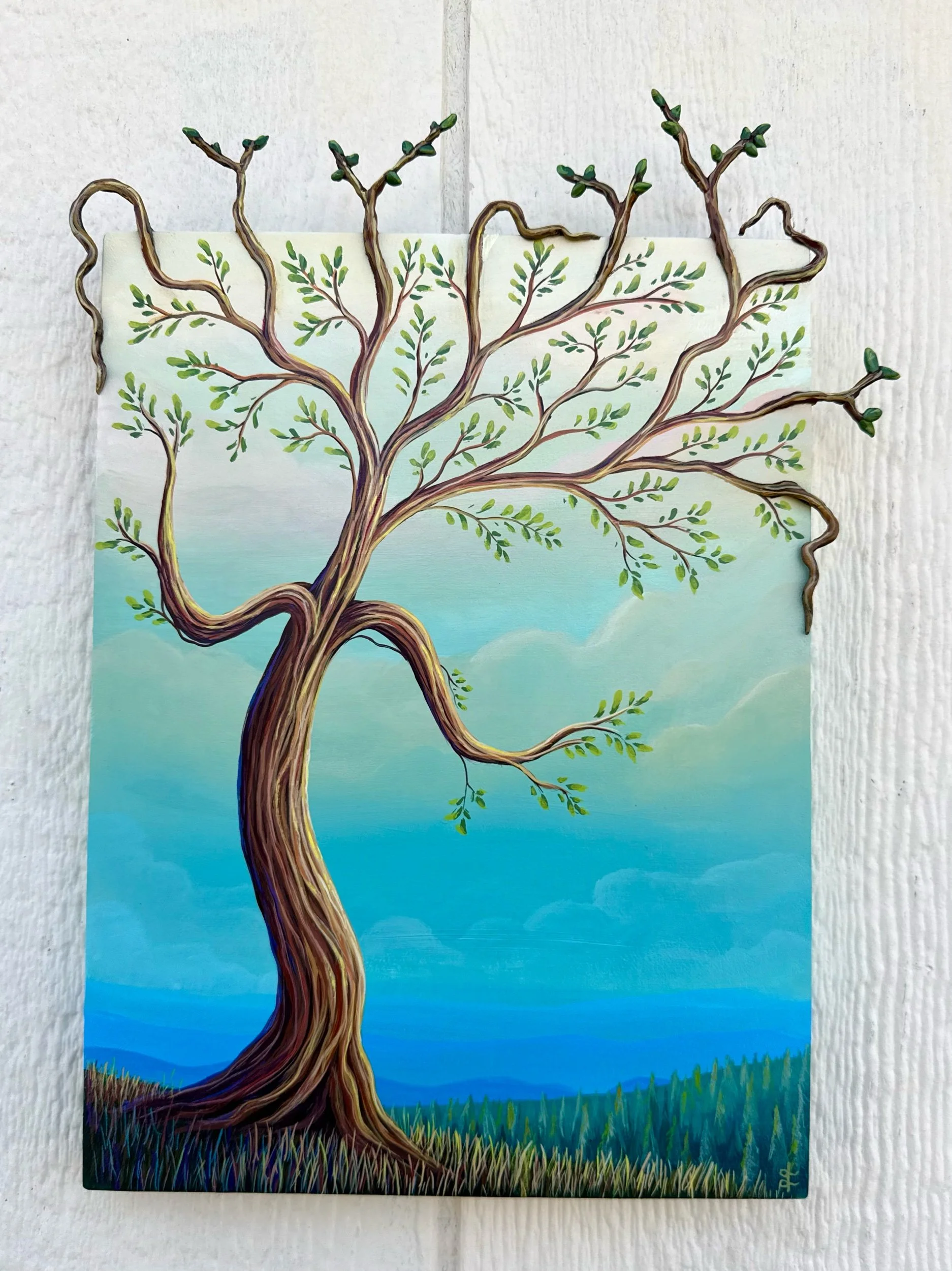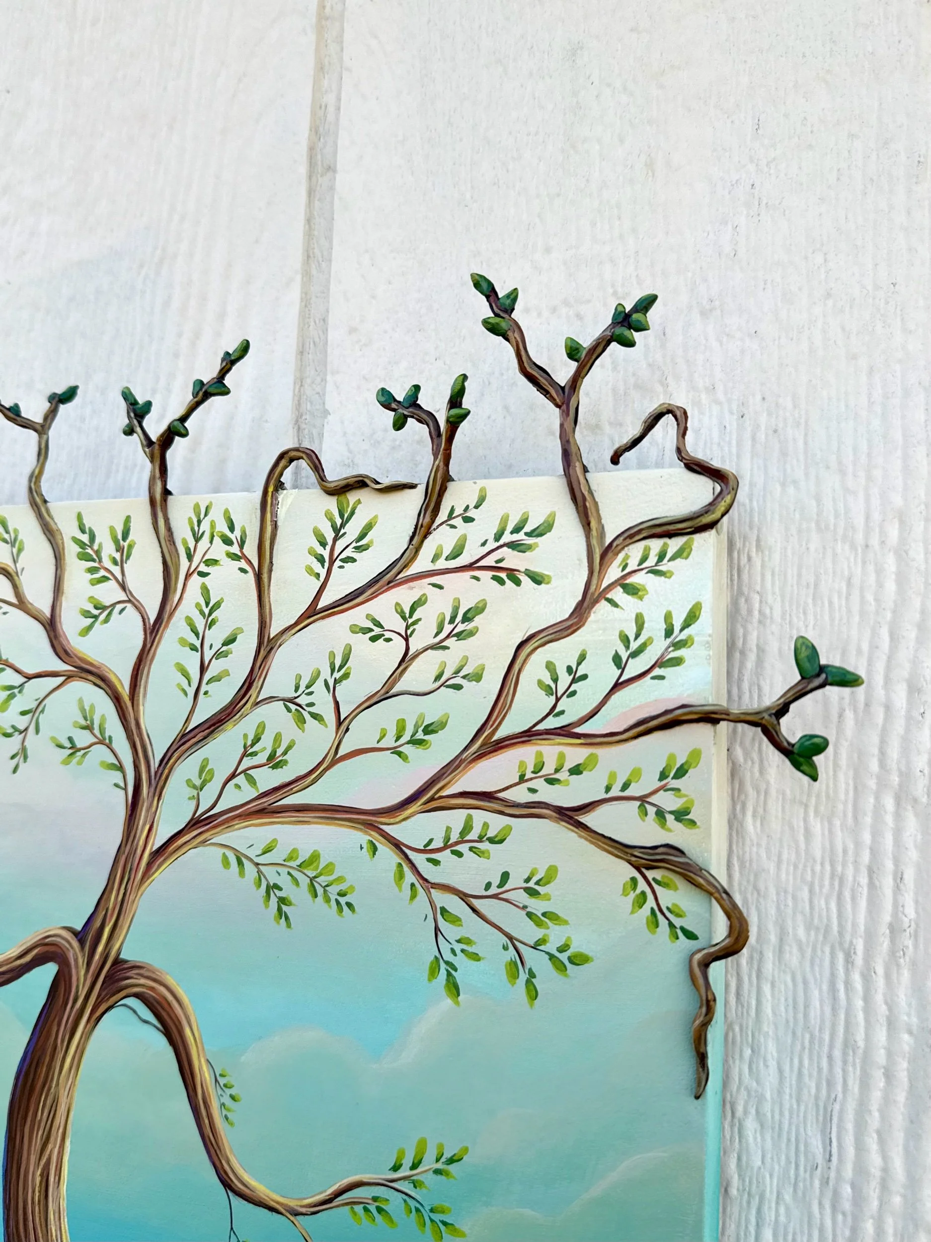 Branches in Bloom II, by Lindsay Liboiron is a whimsical painting featuring a dancing tree with branches extending off the canvas. Painted in acrylic and Epoxy Clay on Cradled Panel 12 x 9 in (extends to 14 x 11 in), 0.75 inch depth.