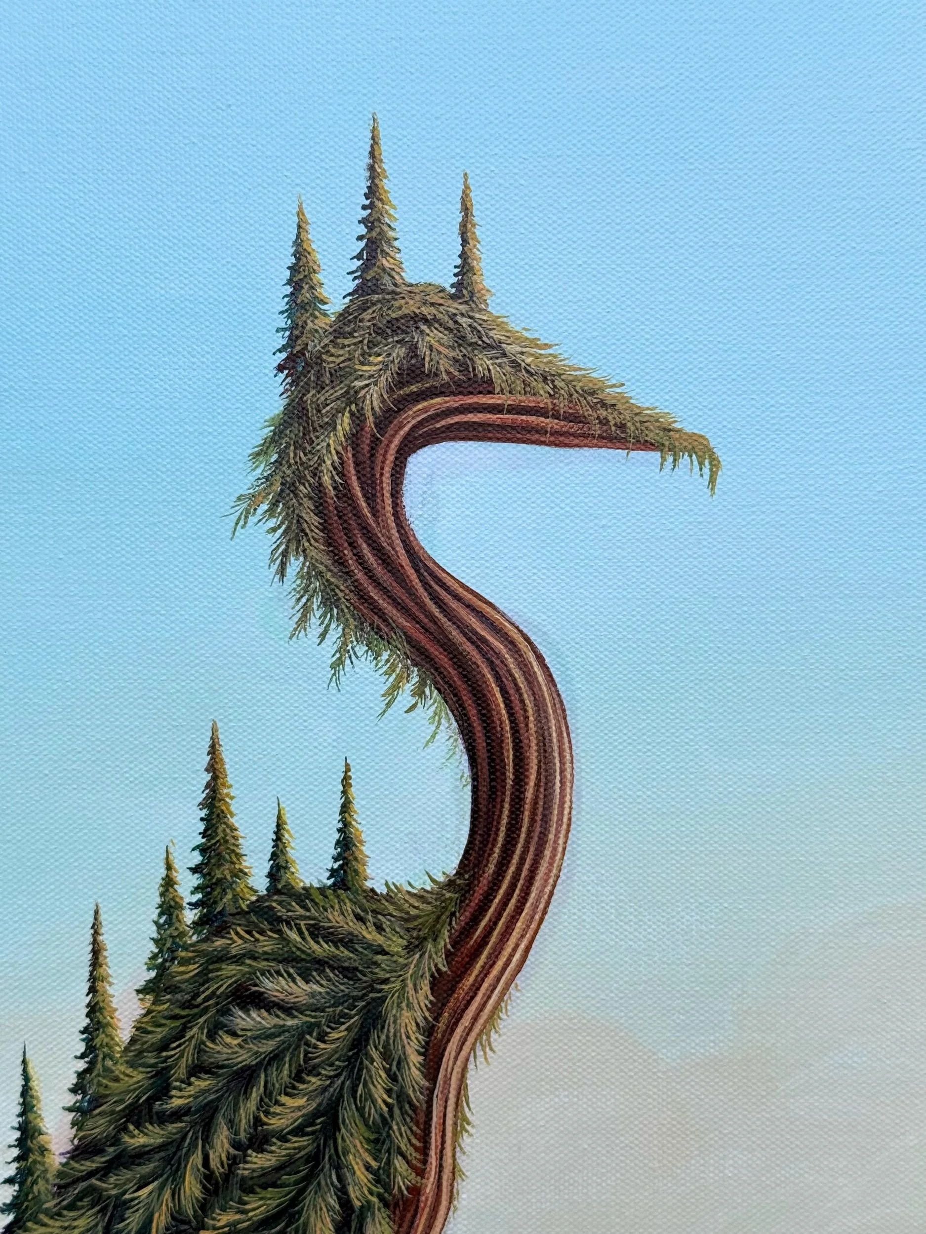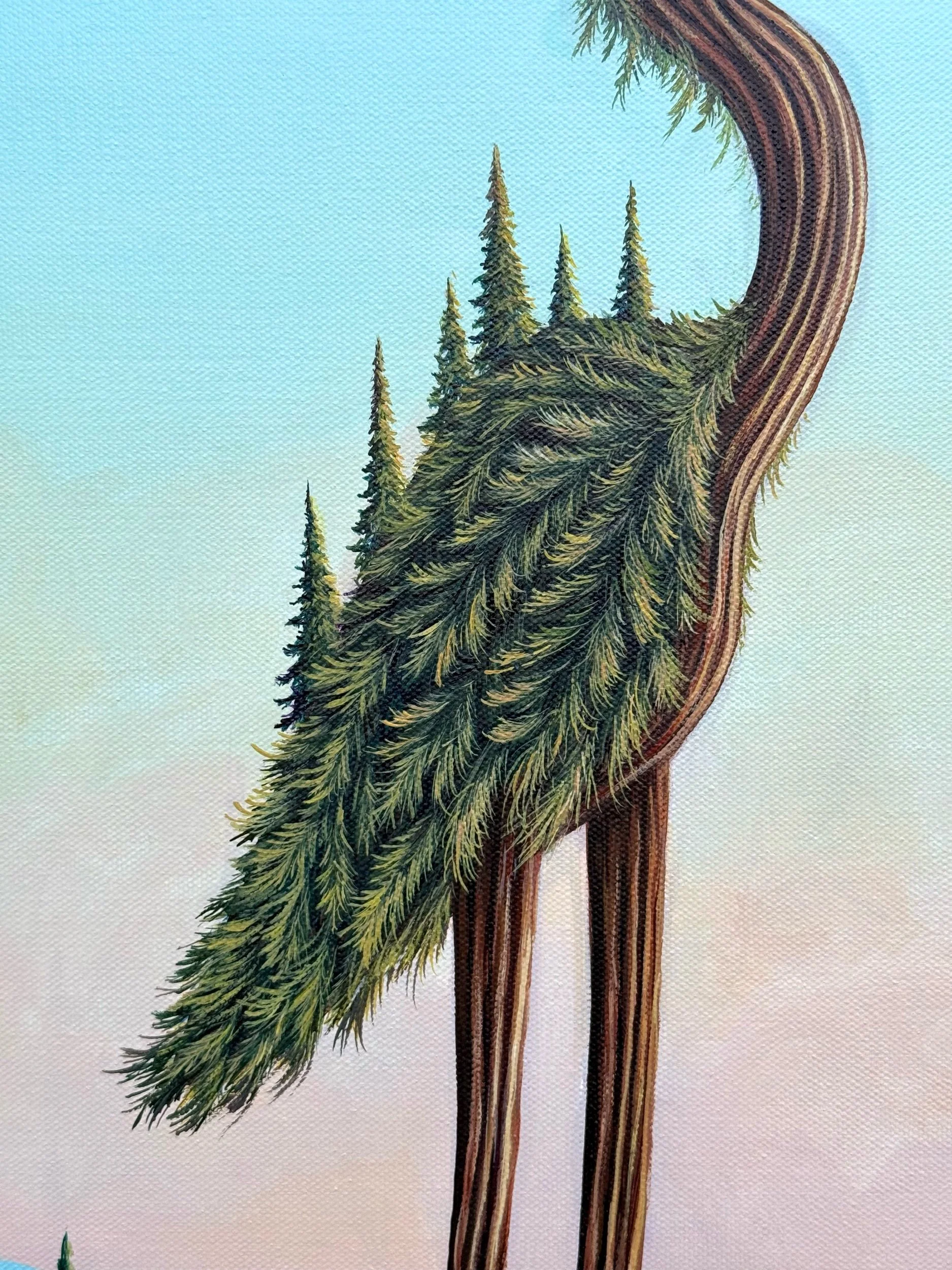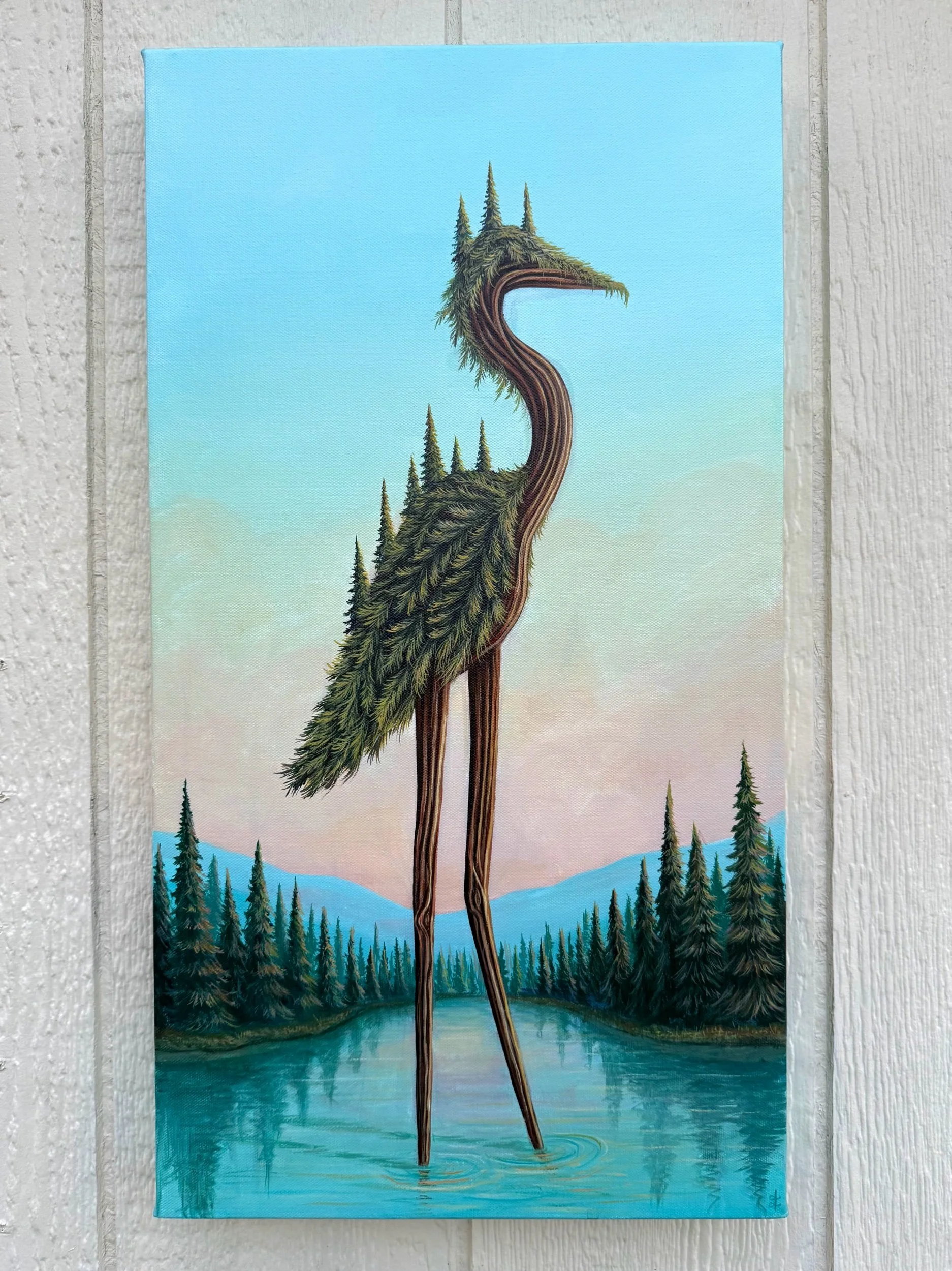Heron Among the Pines, by Lindsay Liboiron is a whimsical painting of a heron standing in a quiet body of water, its back holds a lush pine forest. Painted in acrylic on a 24 × 13 inch gallery wrapped canvas, 1.5 inch depth.