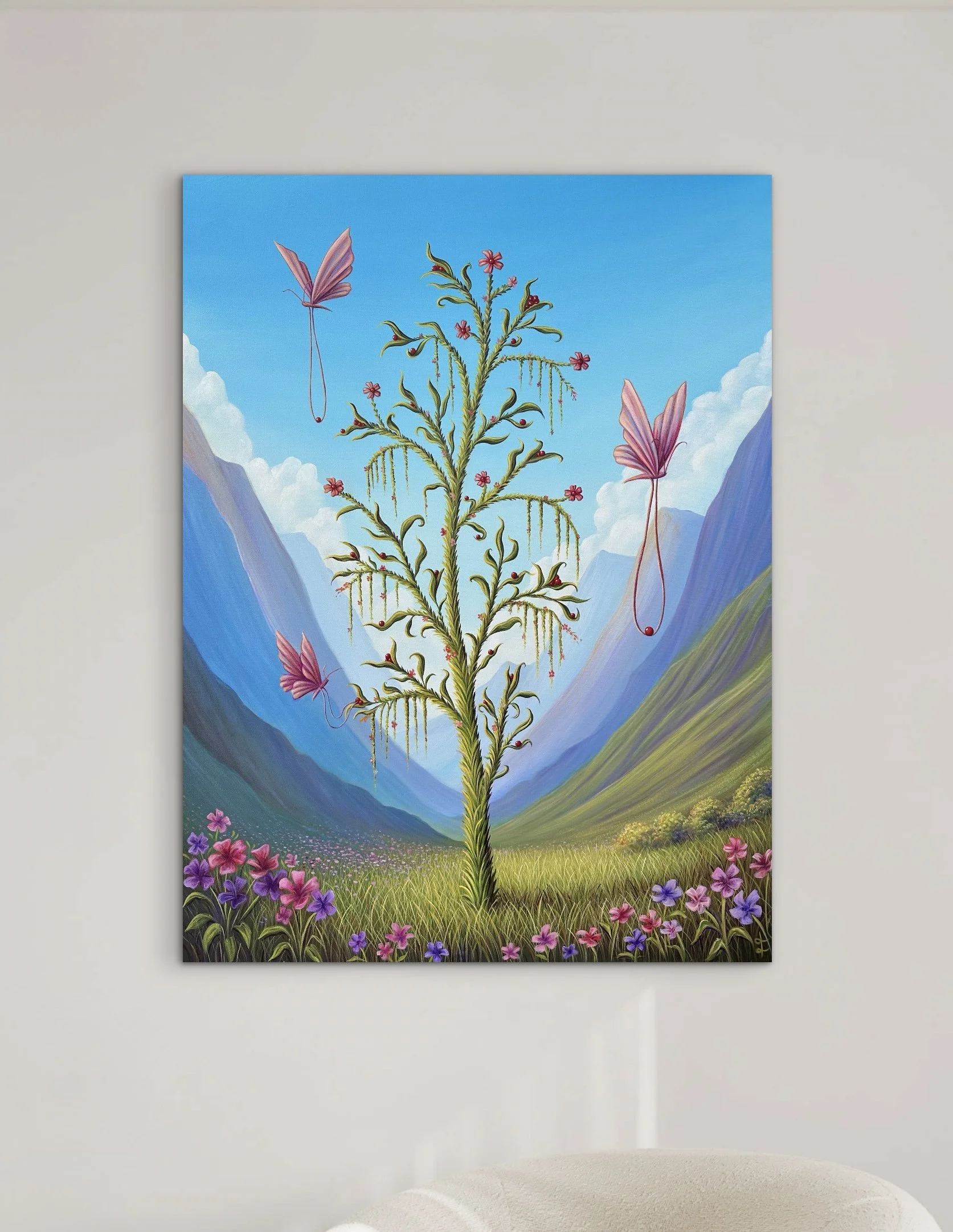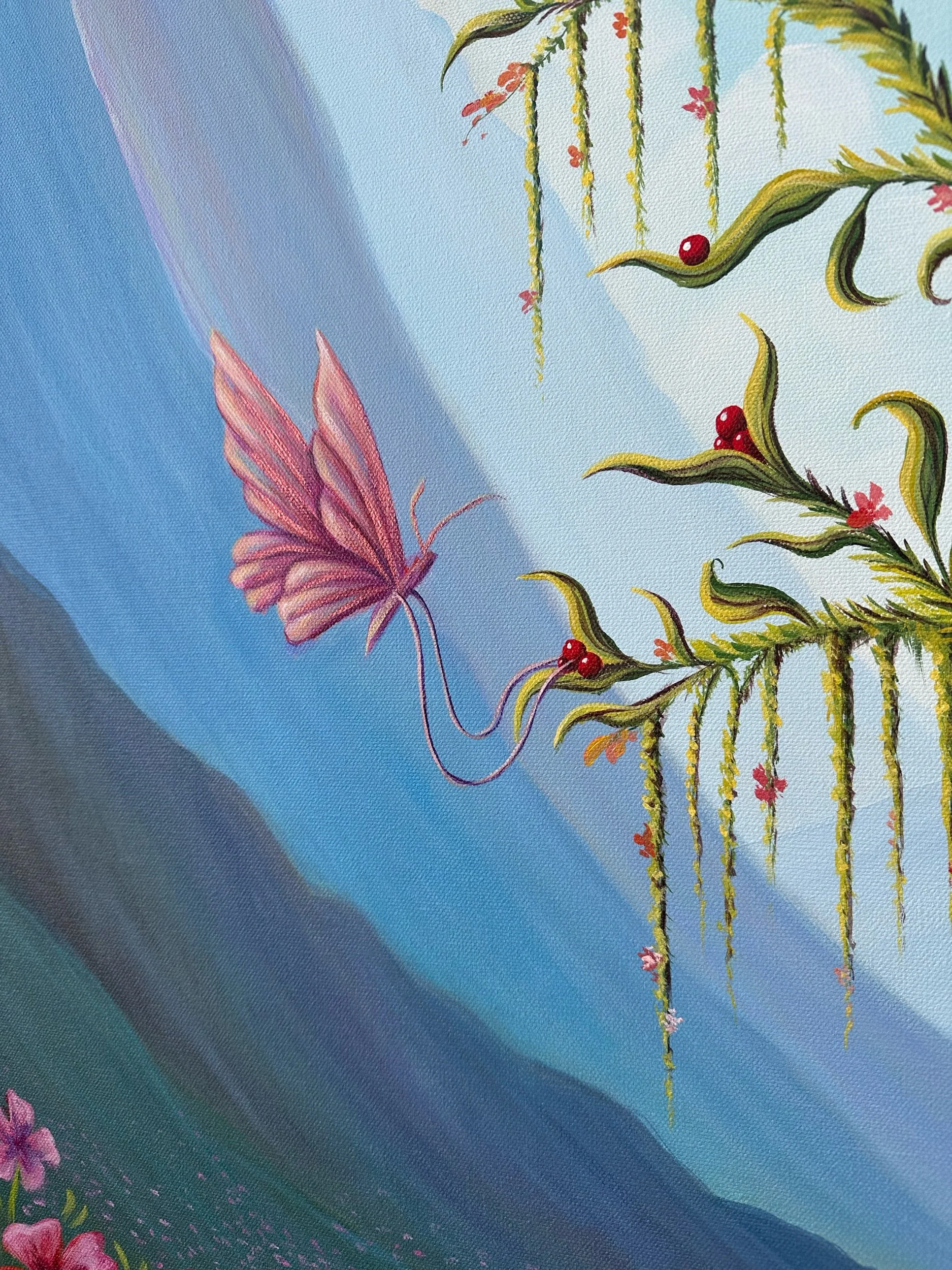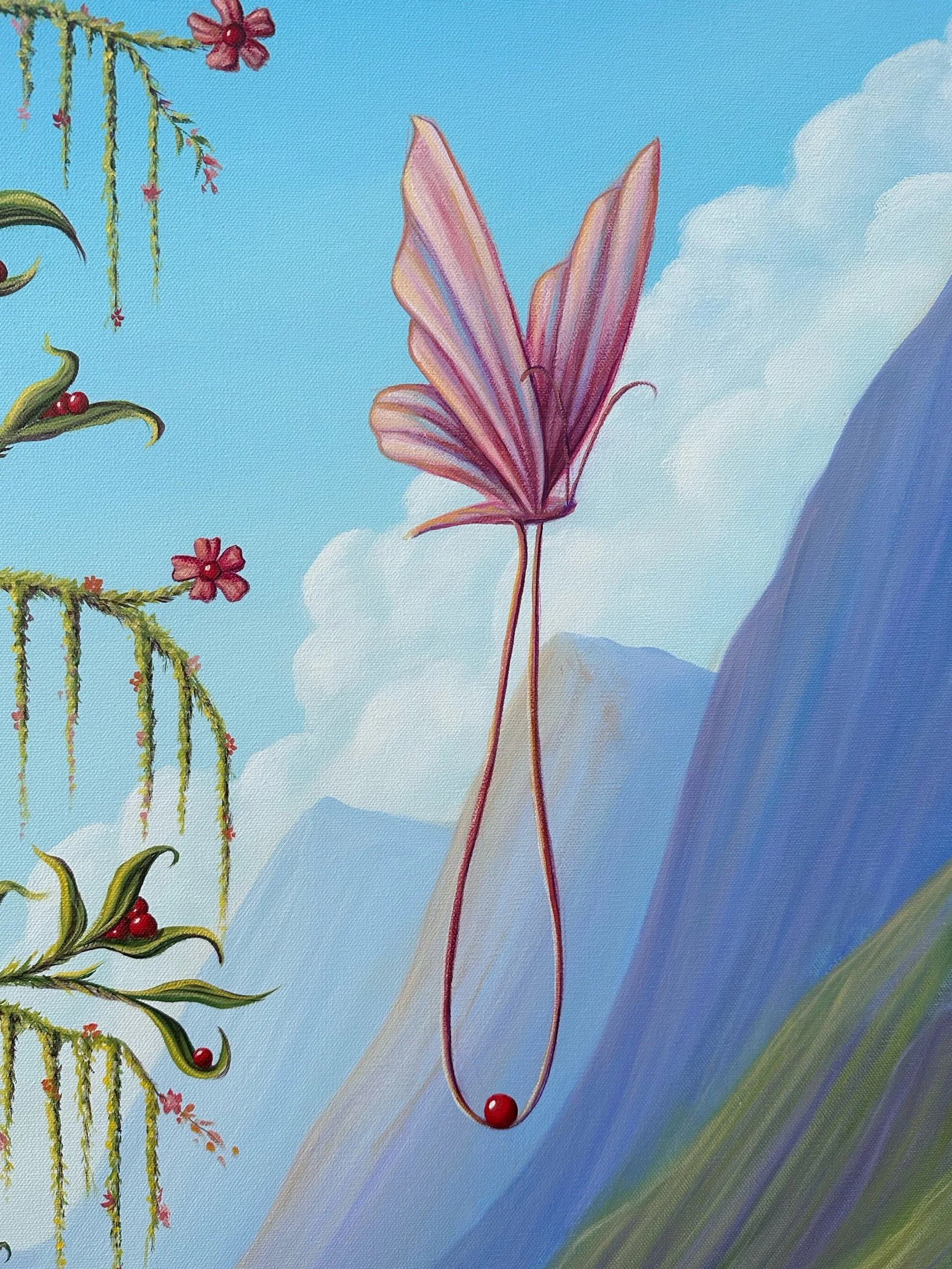 Spring Harvest, by Lindsay Liboiron is a whimsical painting of butterflies harvesting berries within a valley. Painted in acrylic on a 48 × 36 inch gallery wrapped canvas, 1.5 inch depth.