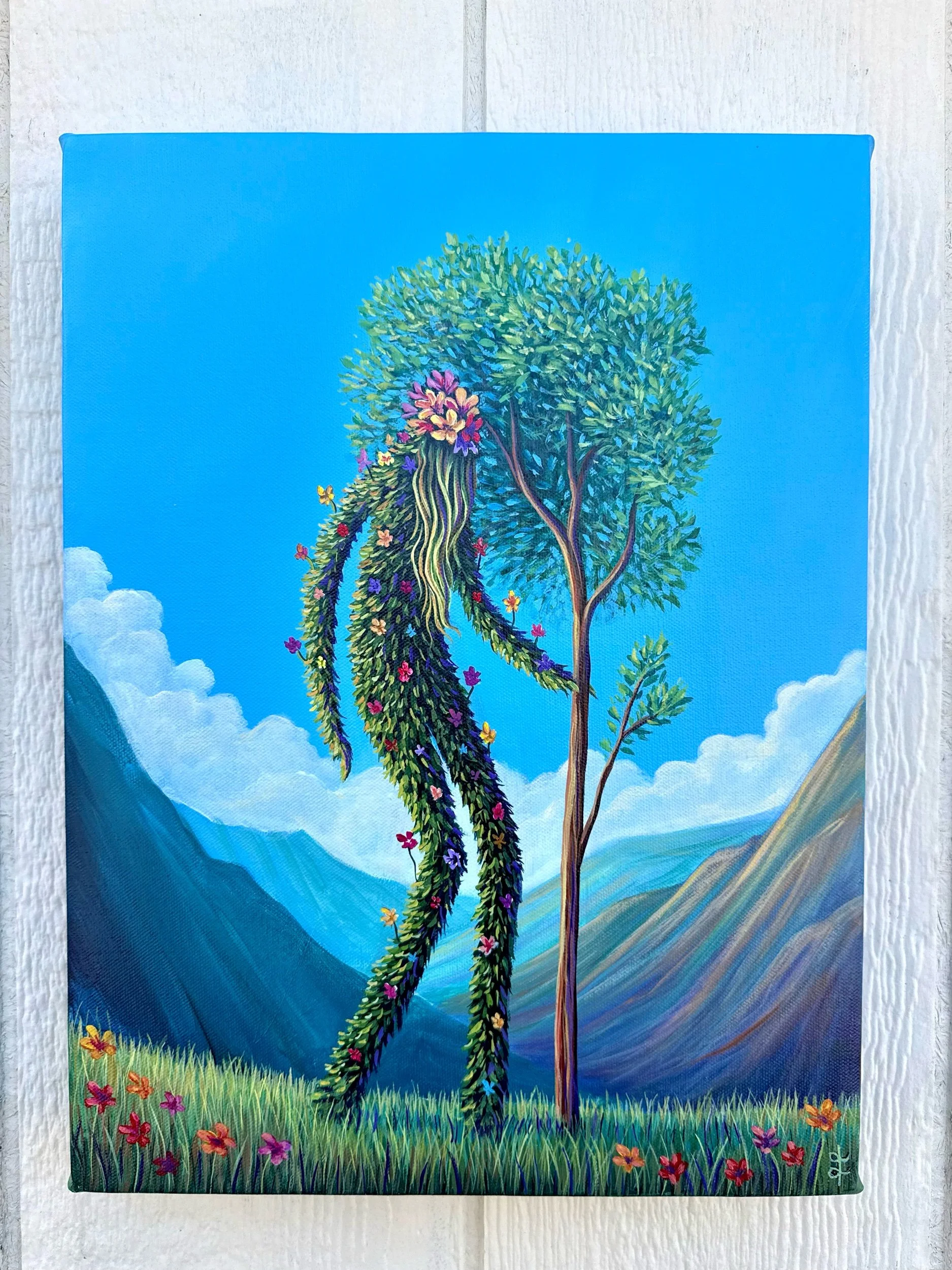 Stroll Through the Valley, by Lindsay Liboiron is a whimsical painting featuring a flower creature wandering the valley, using a tree as a walking stick. Painted in acrylic on a 16 × 12 inch gallery wrapped canvas. 1.5 inch depth.