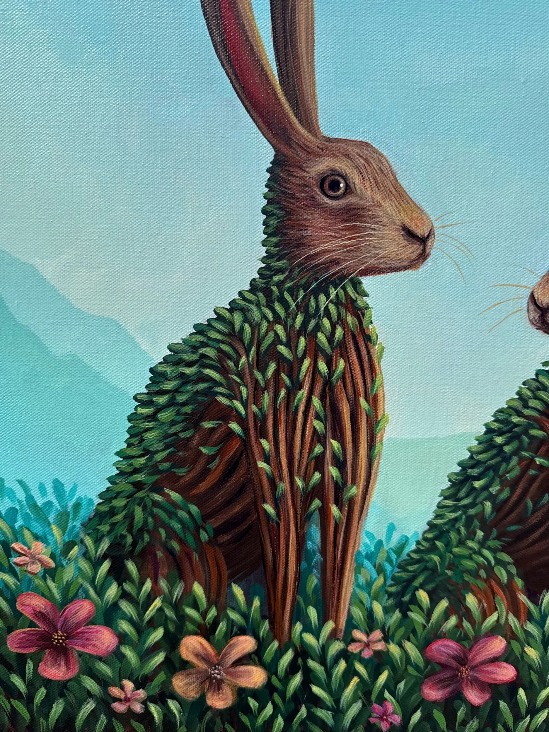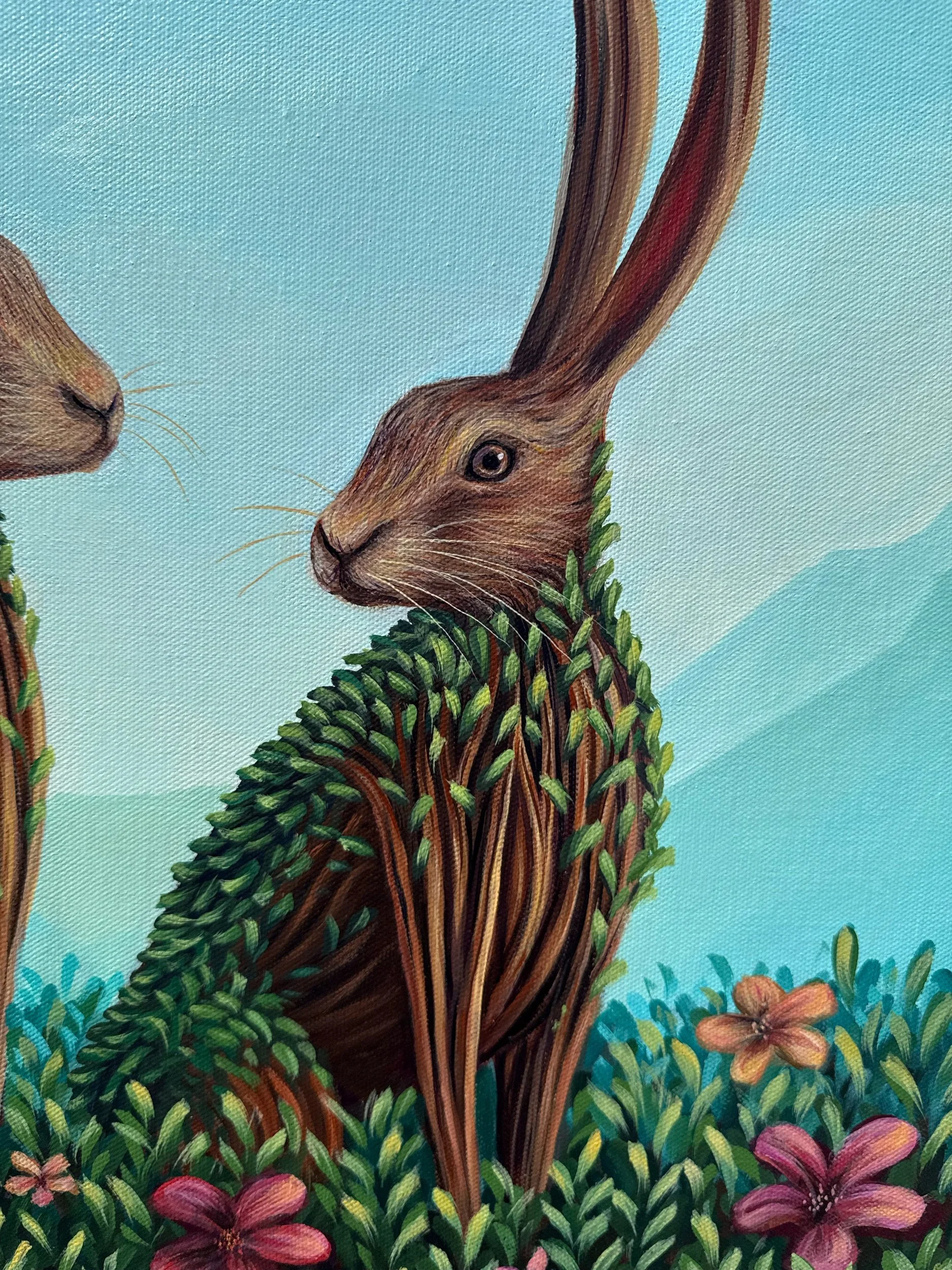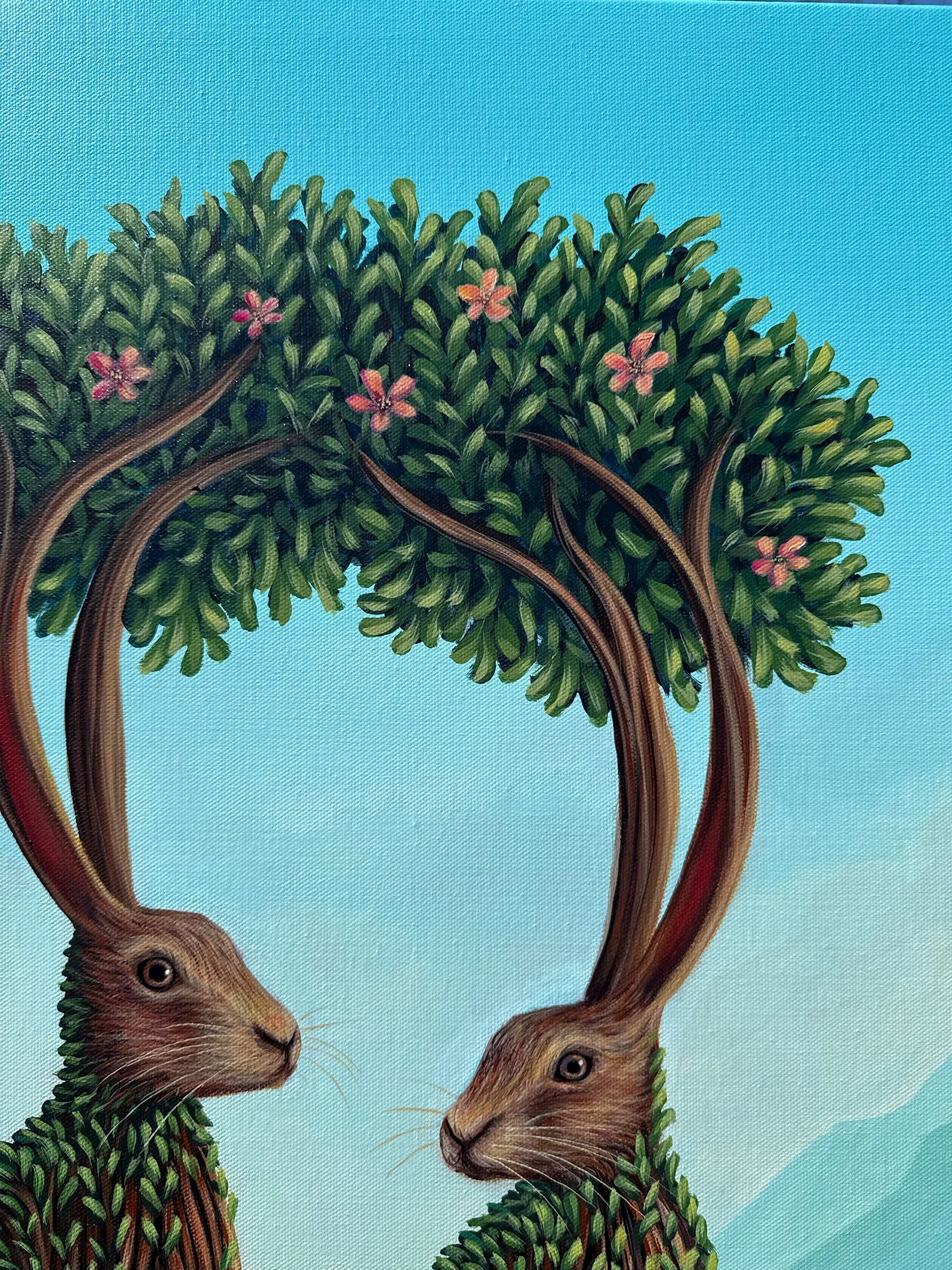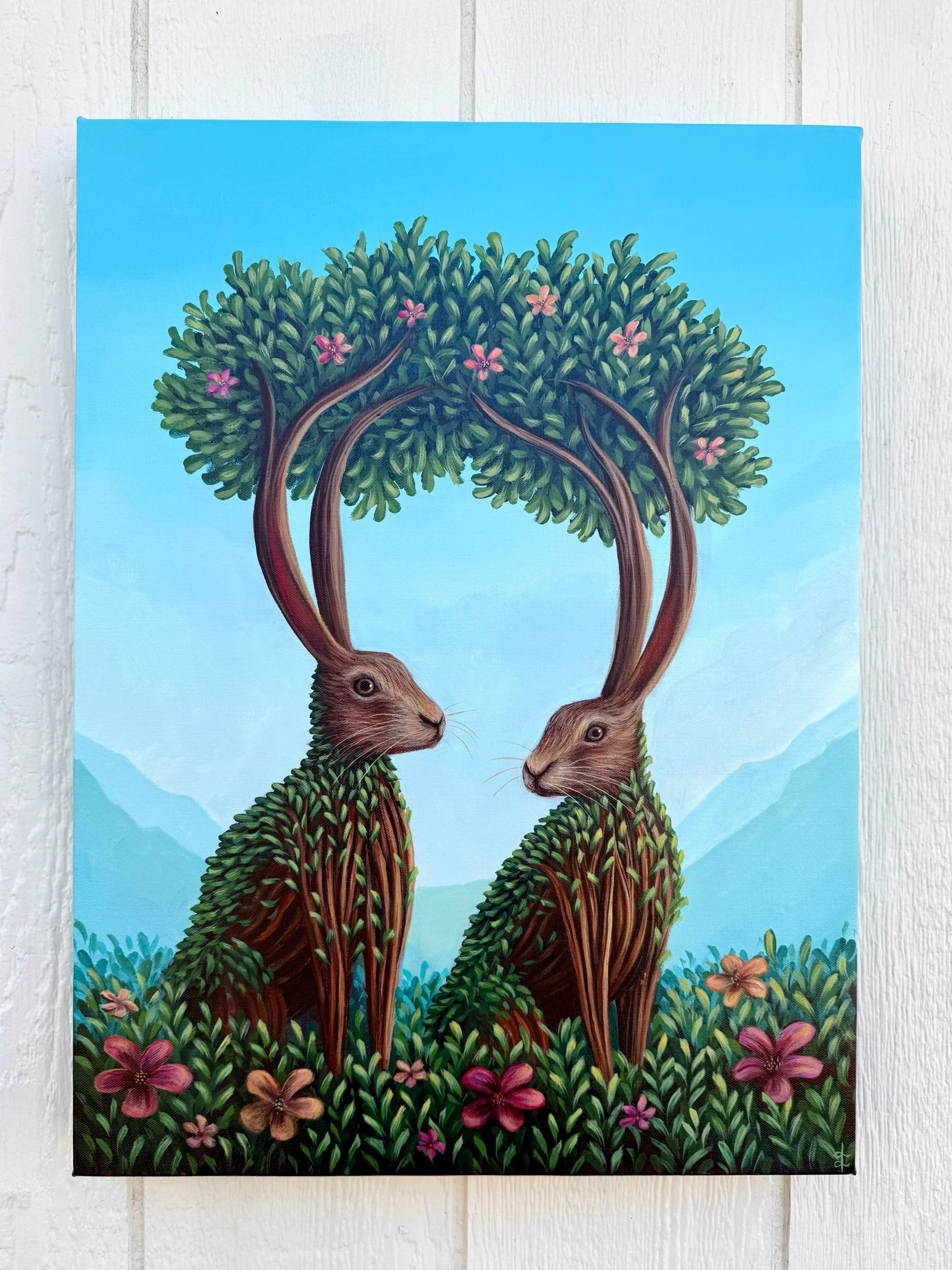The Blossoms We Share, by Lindsay Liboiron is a whimsical painting of two rabbits surrounded by flowers, and a flower bush growing from their ears. Painted in acrylic on a 24 × 18 inch gallery wrapped canvas, 1.5 inch depth.