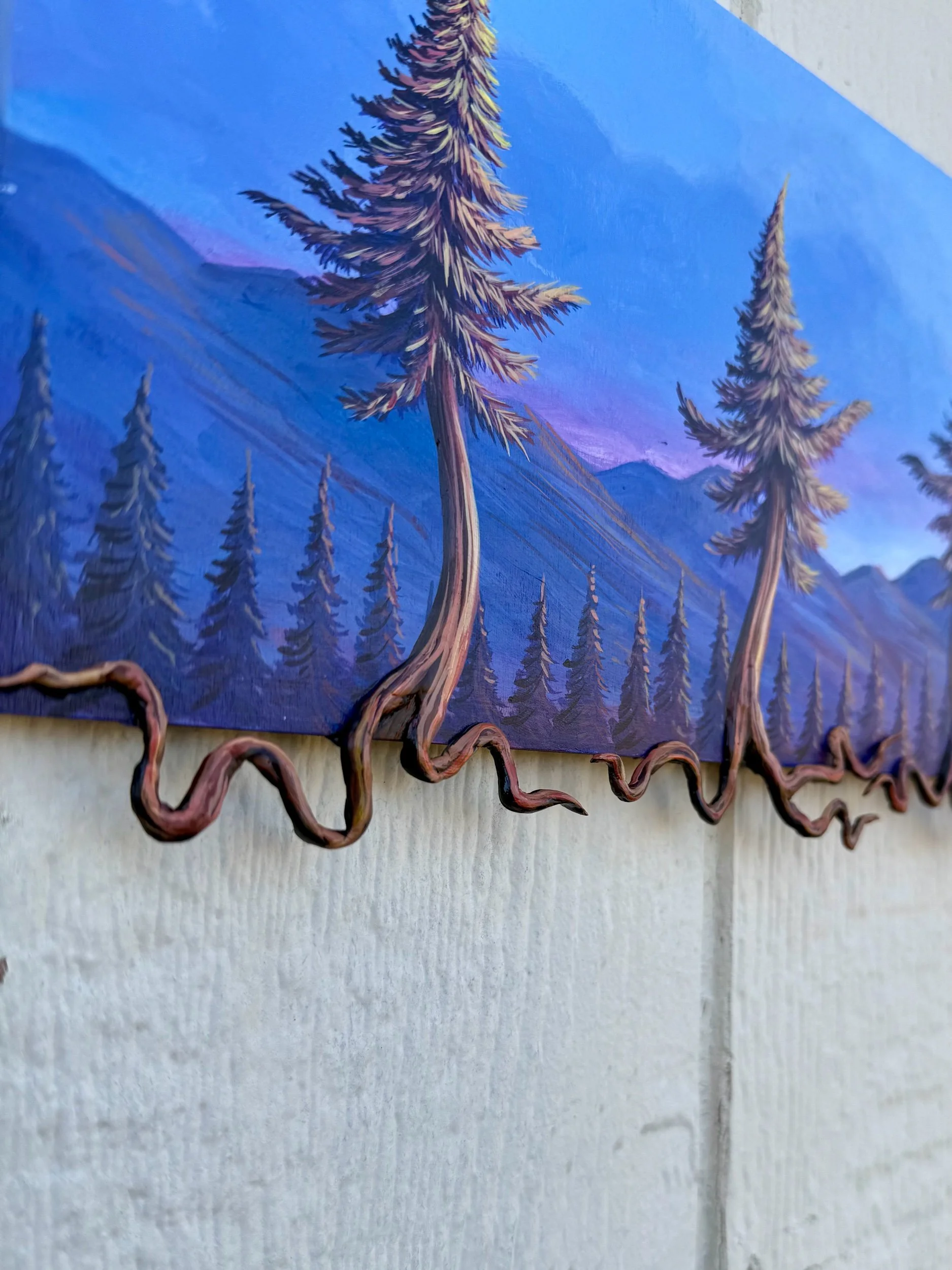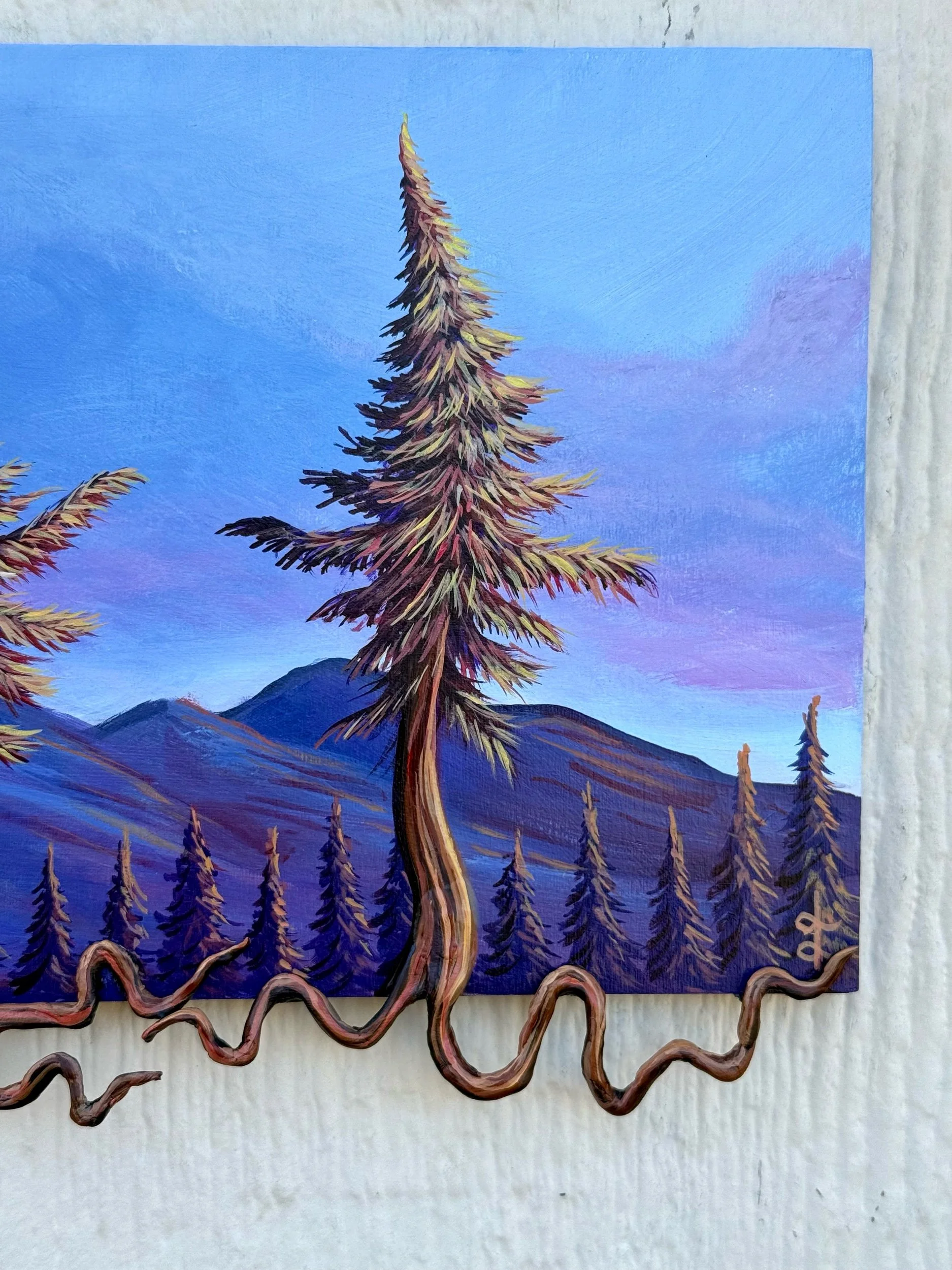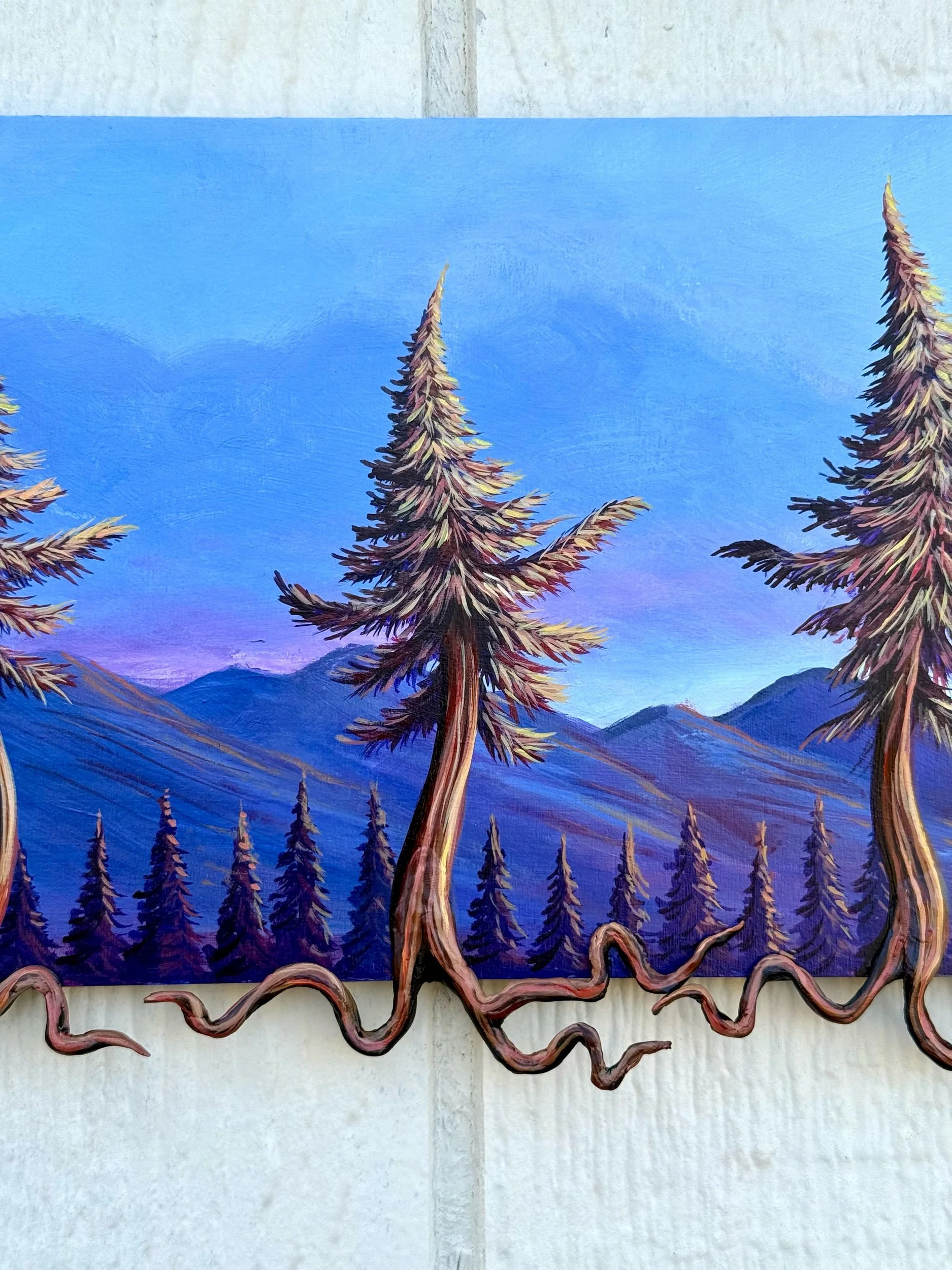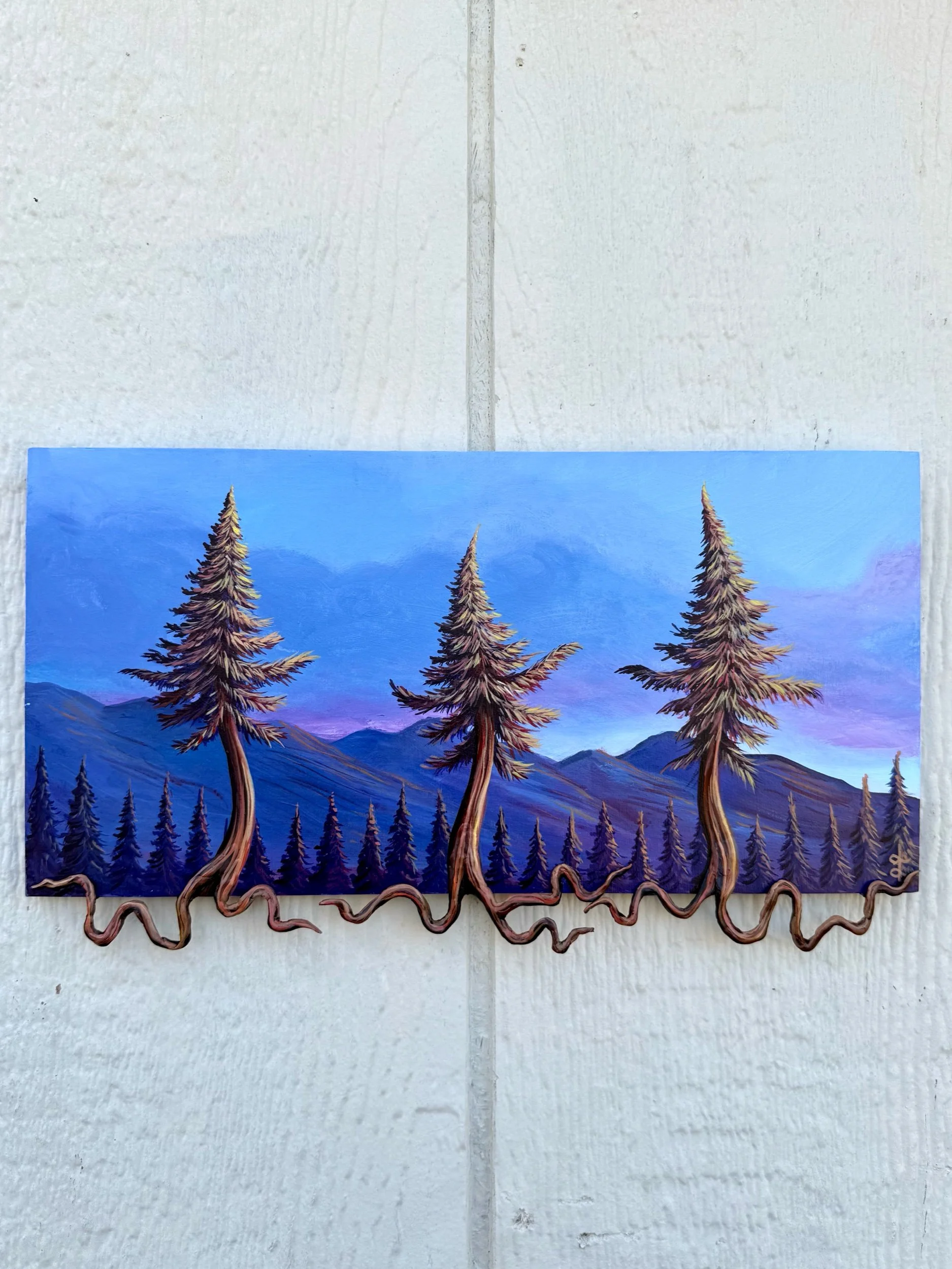 The Dancing Three, by Lindsay Liboiron is a whimsical painting of three dancing trees with roots extending off the canvas. Painted in acrylic on 6 x 12 in (extends to 7 x 12 in) cradled panel, 0.40 inch depth.
