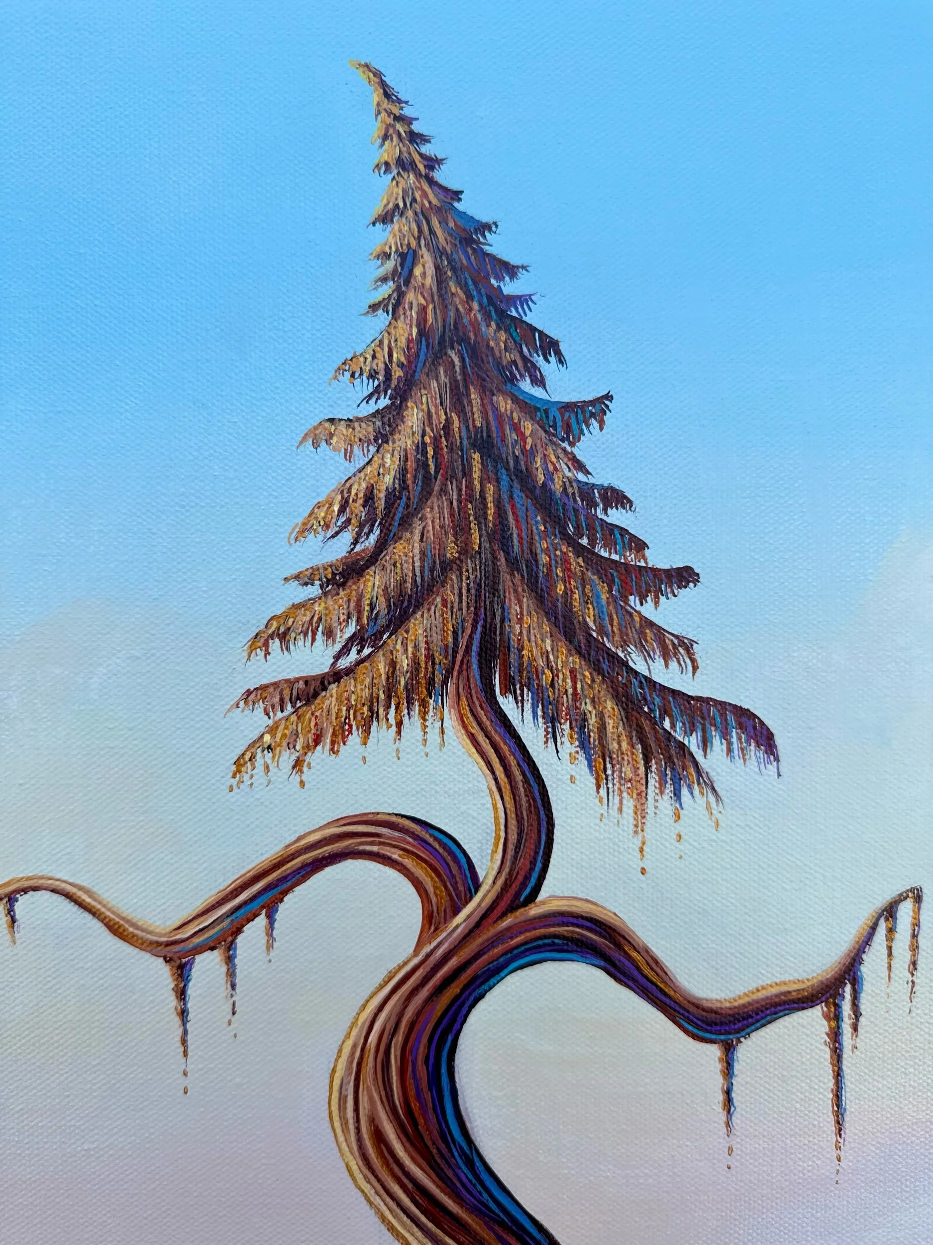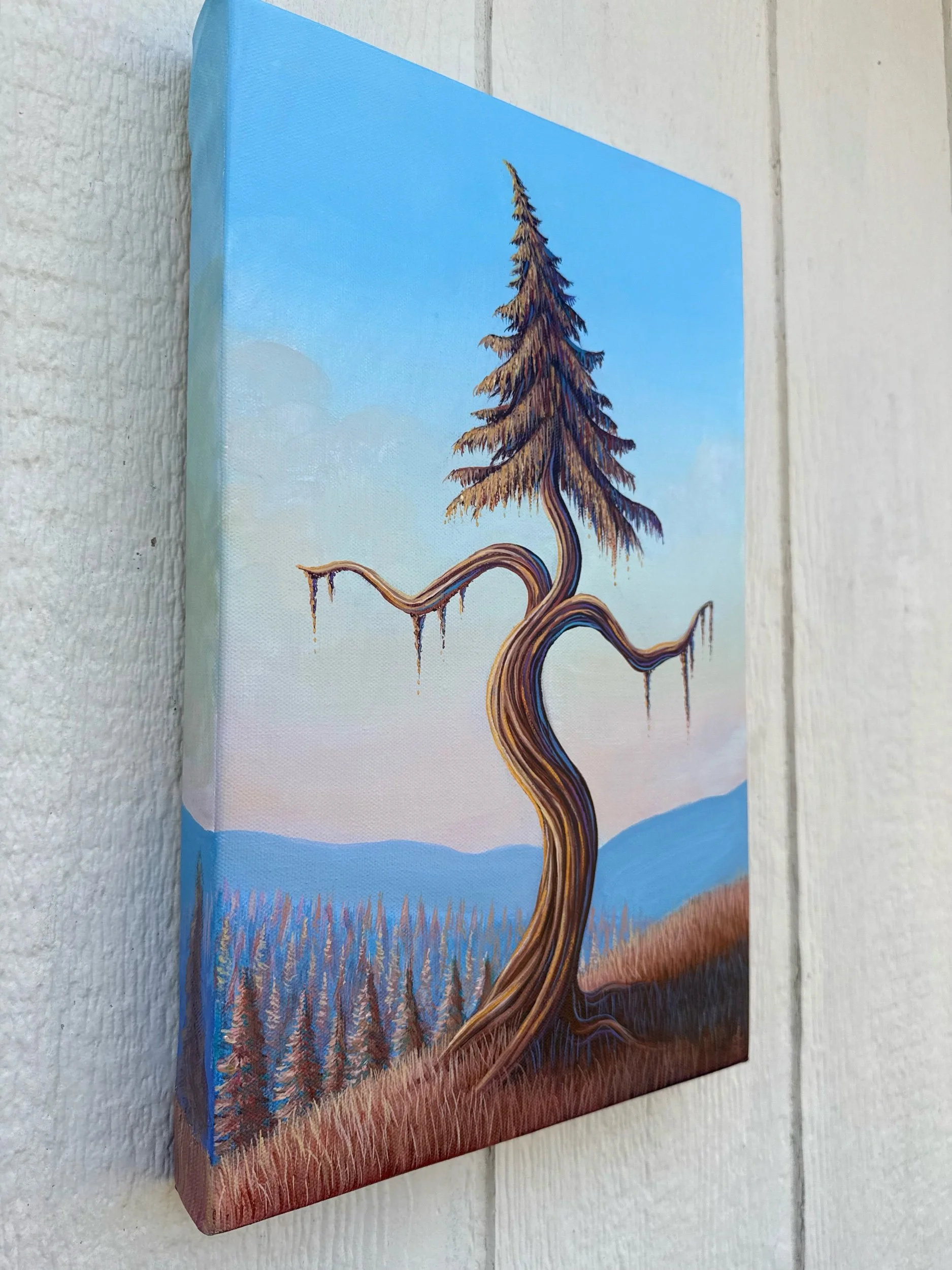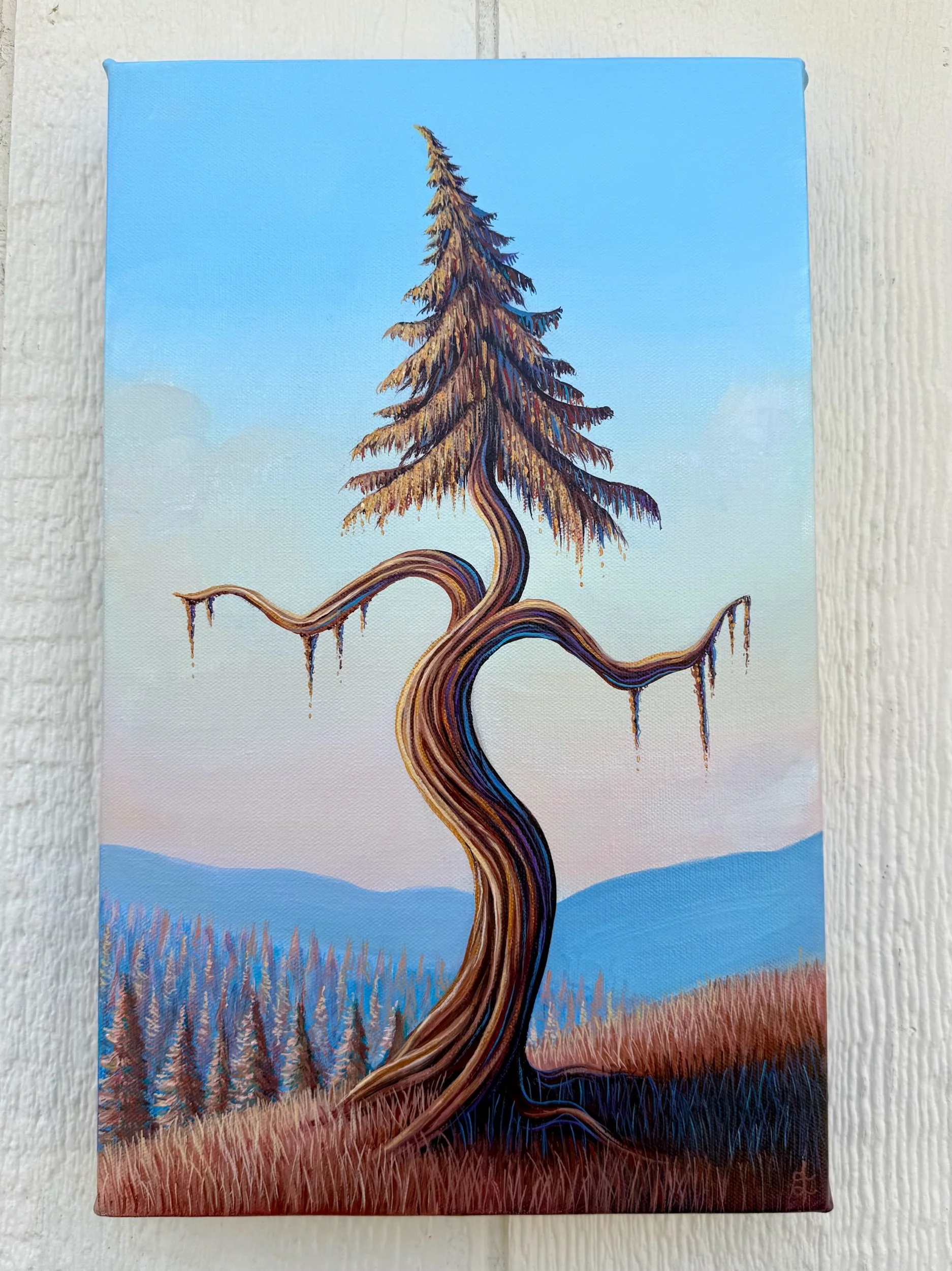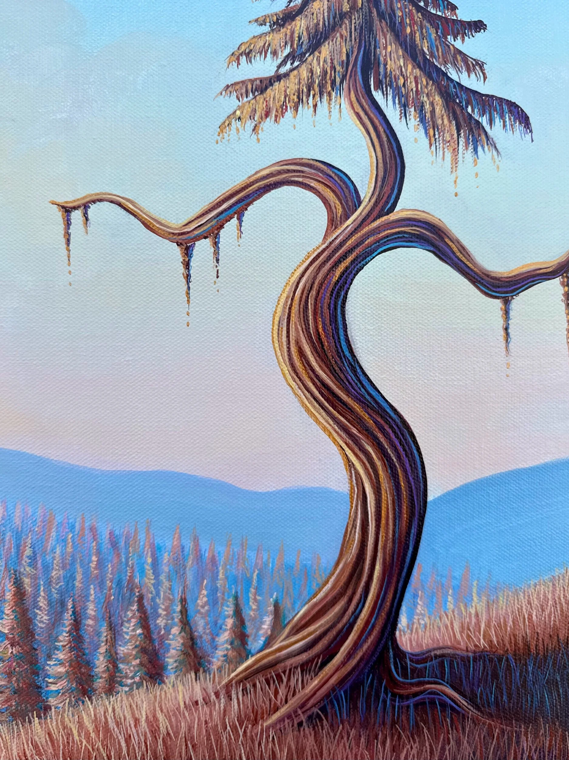 The Dancing Tree at Sunset, by Lindsay Liboiron is a whimsical painting of a tree dancing on a hillside. Painted in acrylic on a 16 × 10 inch gallery wrapped canvas, 1.5 inch depth.