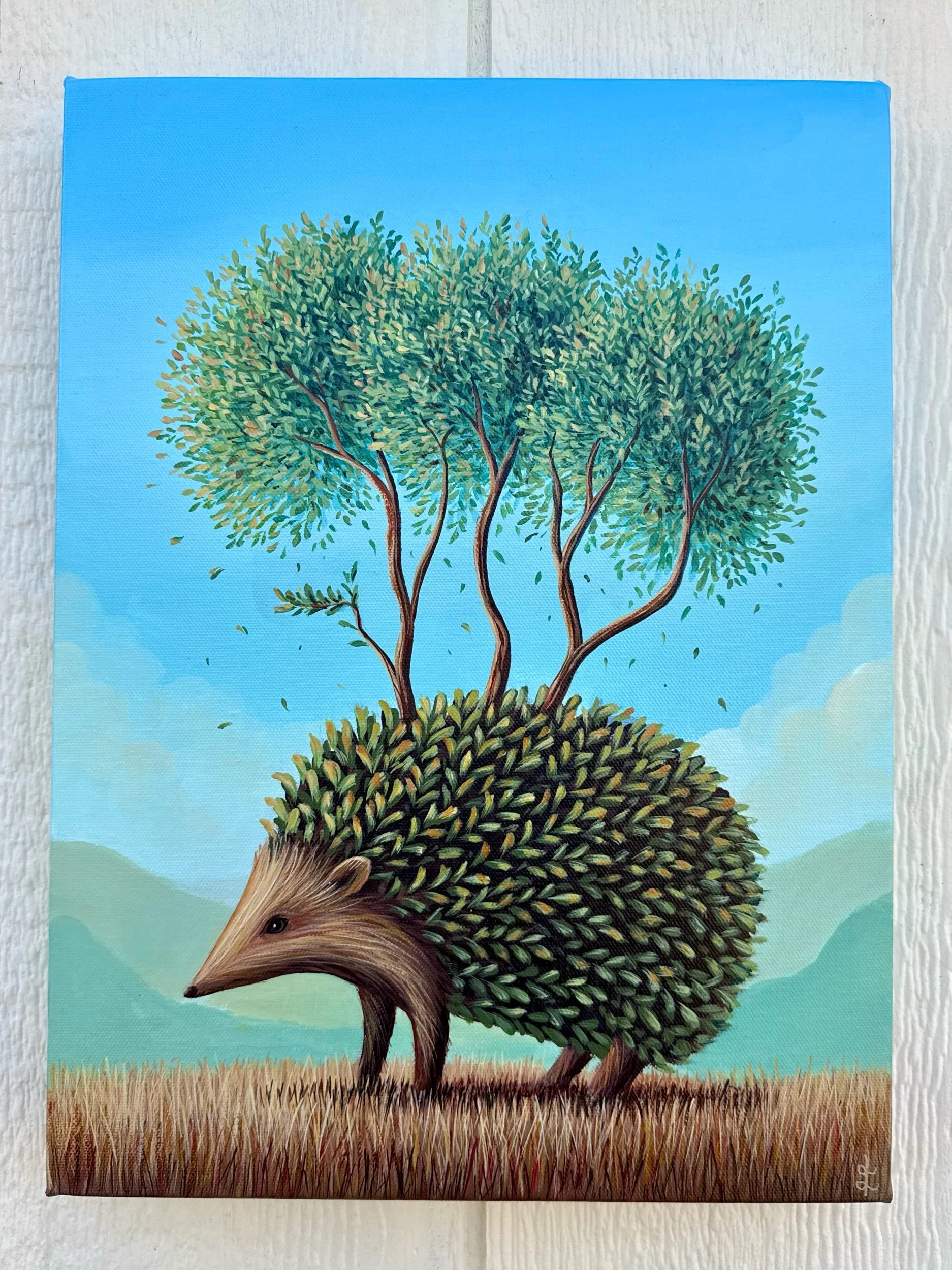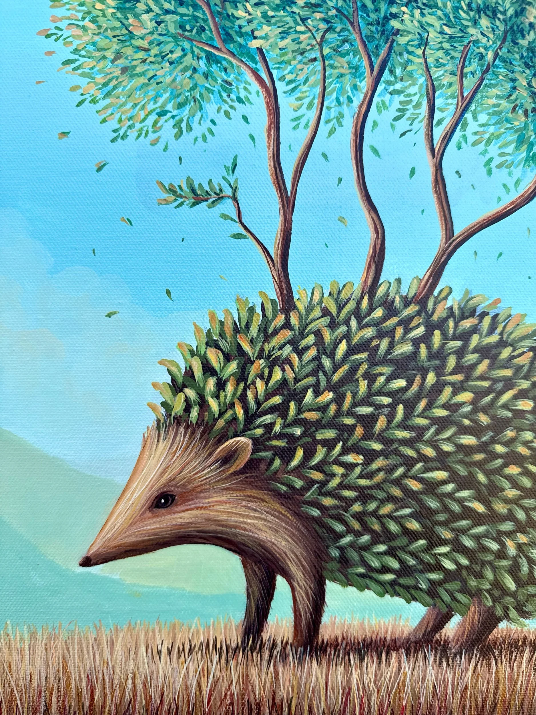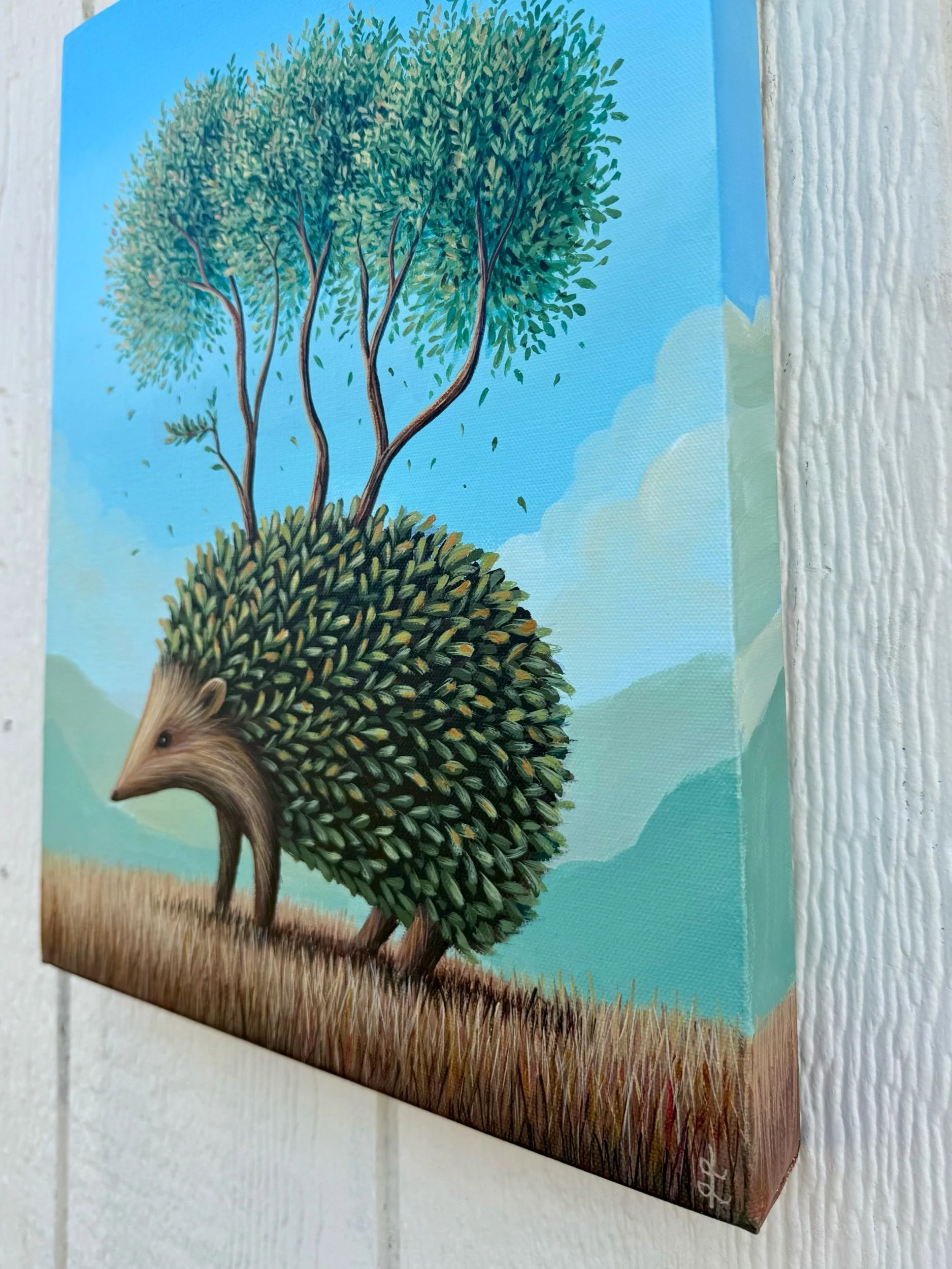 The Travelling Hedge, by Lindsay Liboiron is a whimsical painting of a hedgehog made of leaves, with trees growing from his back as he wanders along. Painted in acrylic on a 16 × 12 inch gallery wrapped canvas, 1.5 inch depth.