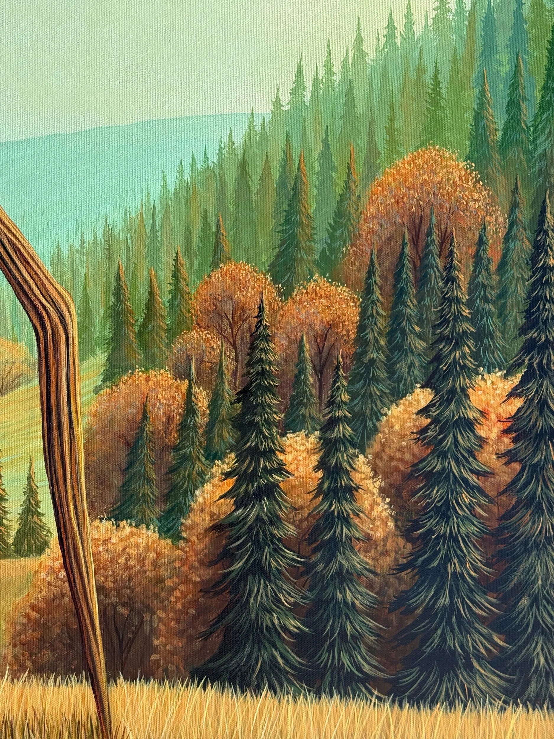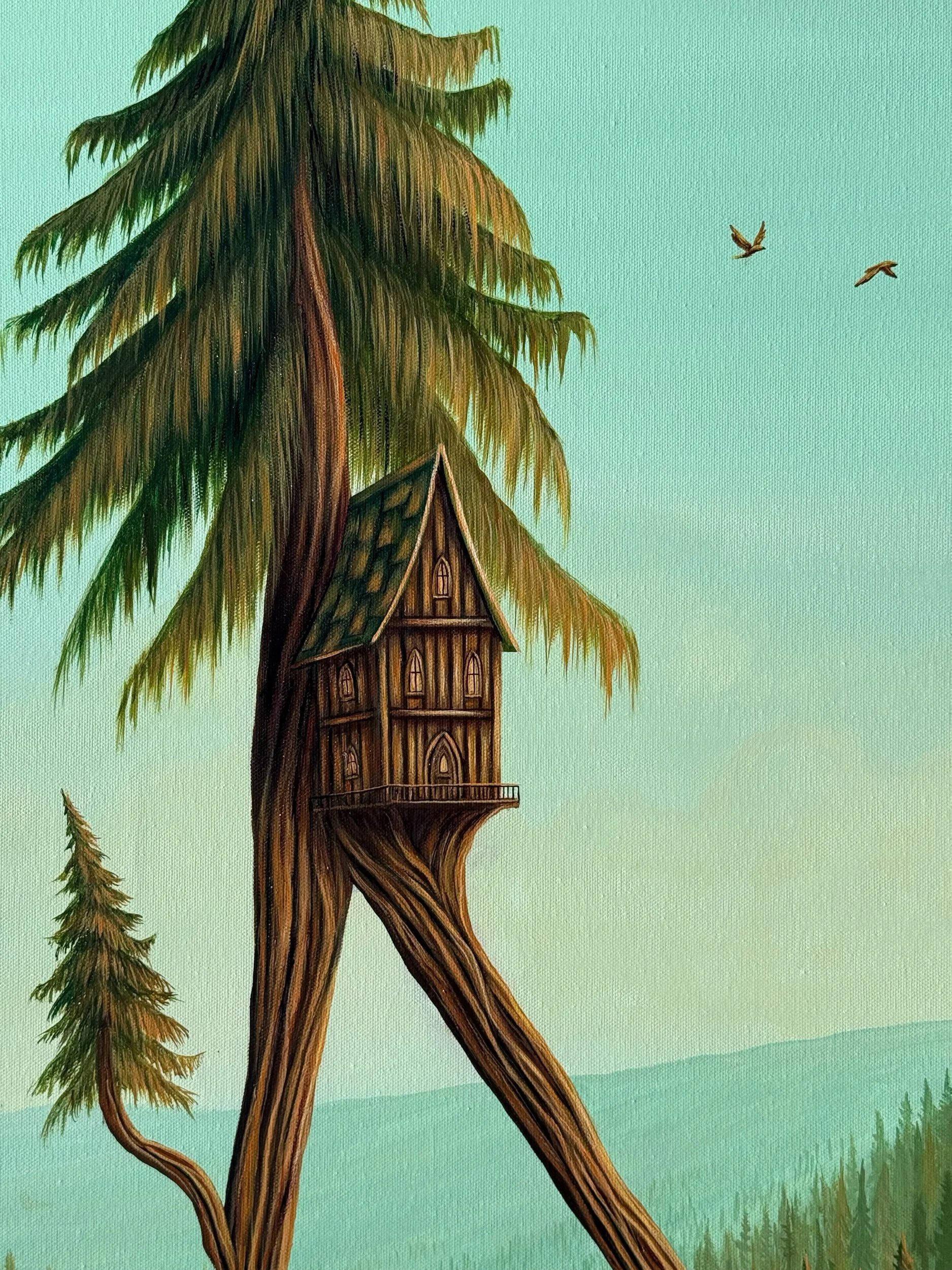 The Wandering House of Branches, by Lindsay Liboiron is a whimsical painting of a walking treehouse within an autumn landscape. Painted in acrylic on a 40 × 30 inch gallery wrapped canvas, 1.5 inch depth.